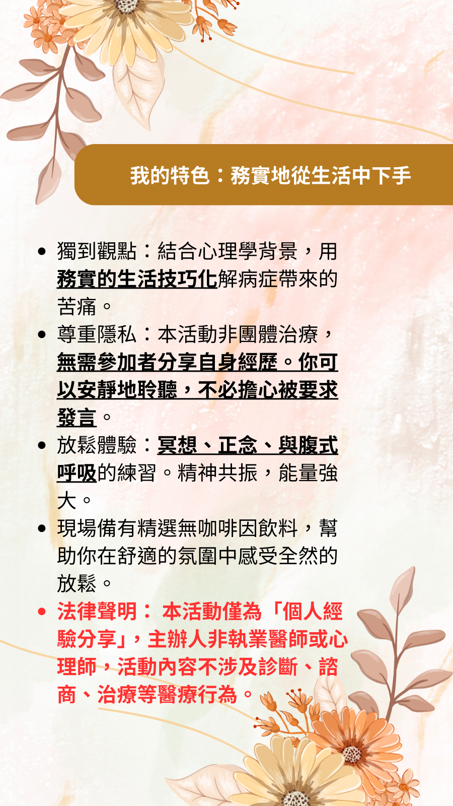 - 法律聲明: 本活動僅為「個人經驗分享」,主辦人非執業醫師或心理師,活動內容不涉及診斷、諮商、治療等醫療行為。