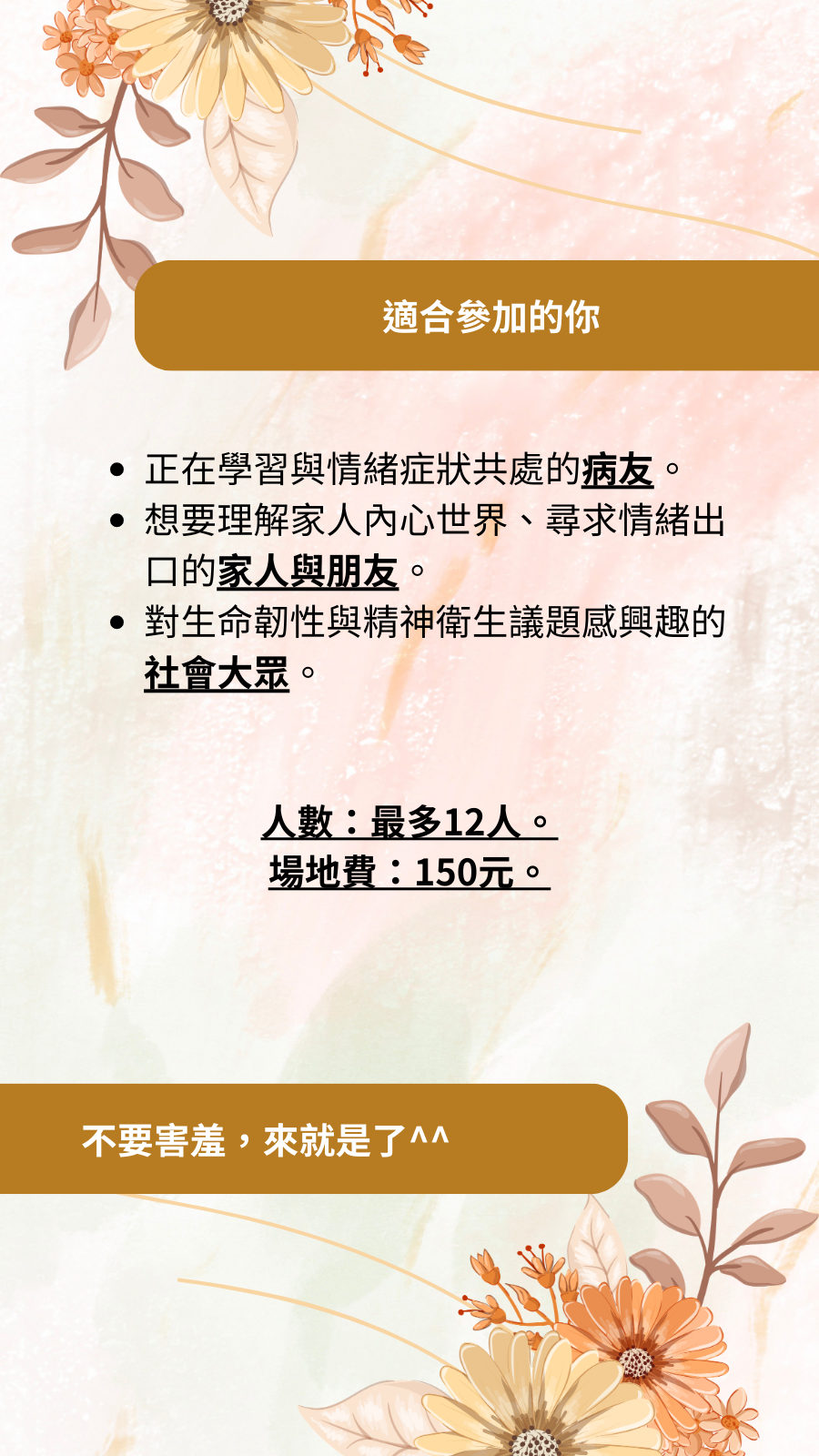 - 本活動僅為「個人經驗分享」,主辦人非執業醫師或心理師,活動內容不涉及診斷、諮商、治療等醫療行為。