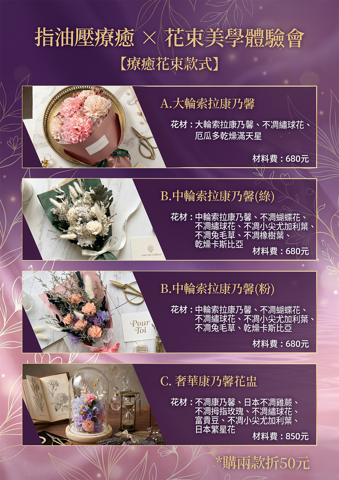 ⚠️ 注意事項:名額有限,需提前預約。報名成功後,將有專人與您聯繫再次確認花束款式及材料準備事宜。本活動為花藝手作與「技術教學演示」,非提供一般消費者按摩服務。