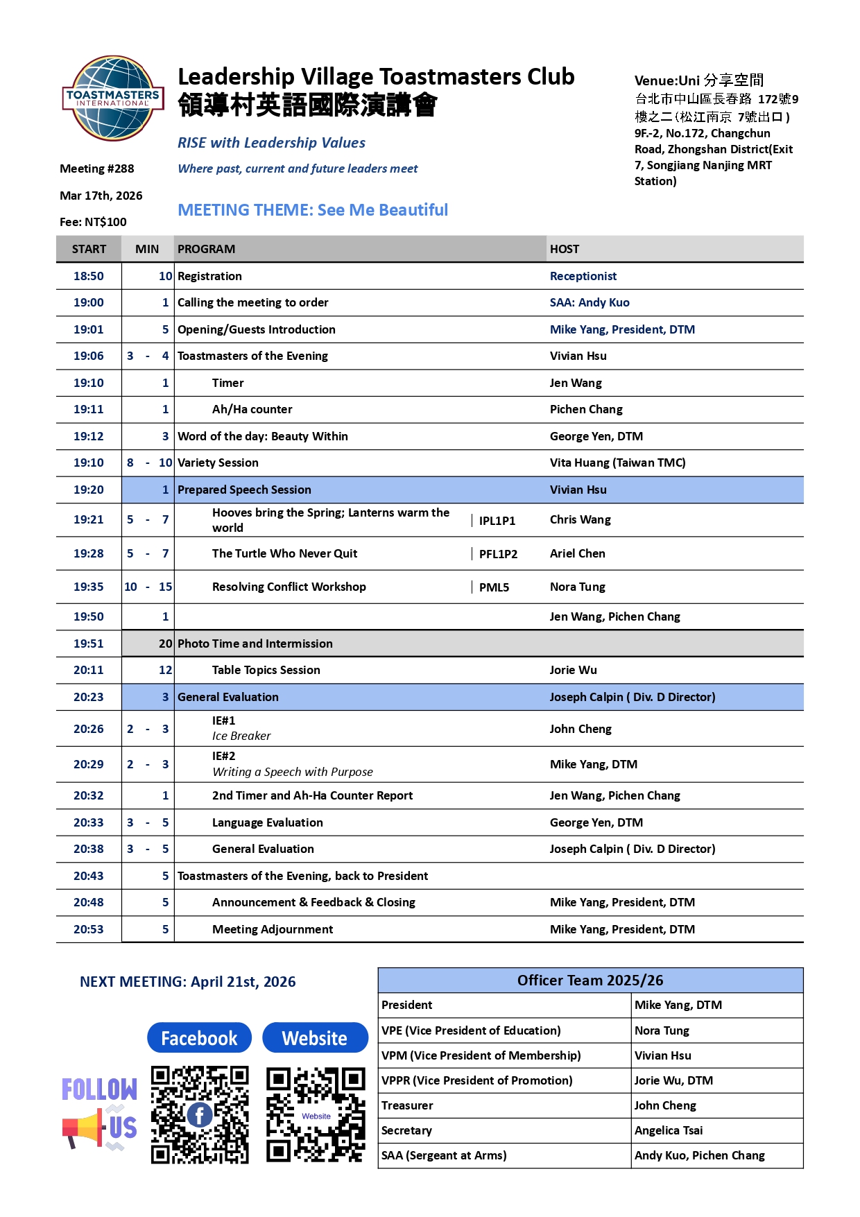 領導村國際演講會 (Leadership Village Toastmasters Club) 的使命是在積極與鼓勵的學習環境中,幫助成員發展英文溝通和領導能力,從而增強自信,促進個人成長。