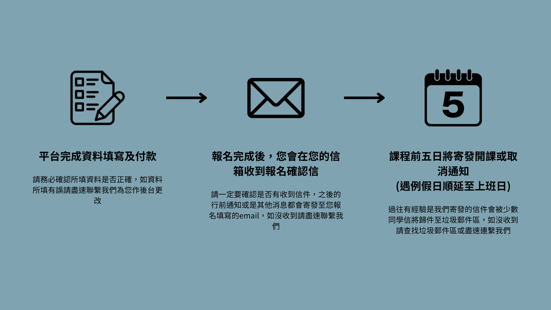 報名時請再次確認填寫資料是否正確,開課、取消或其它資訊將以「email」或「手機簡訊」通知。