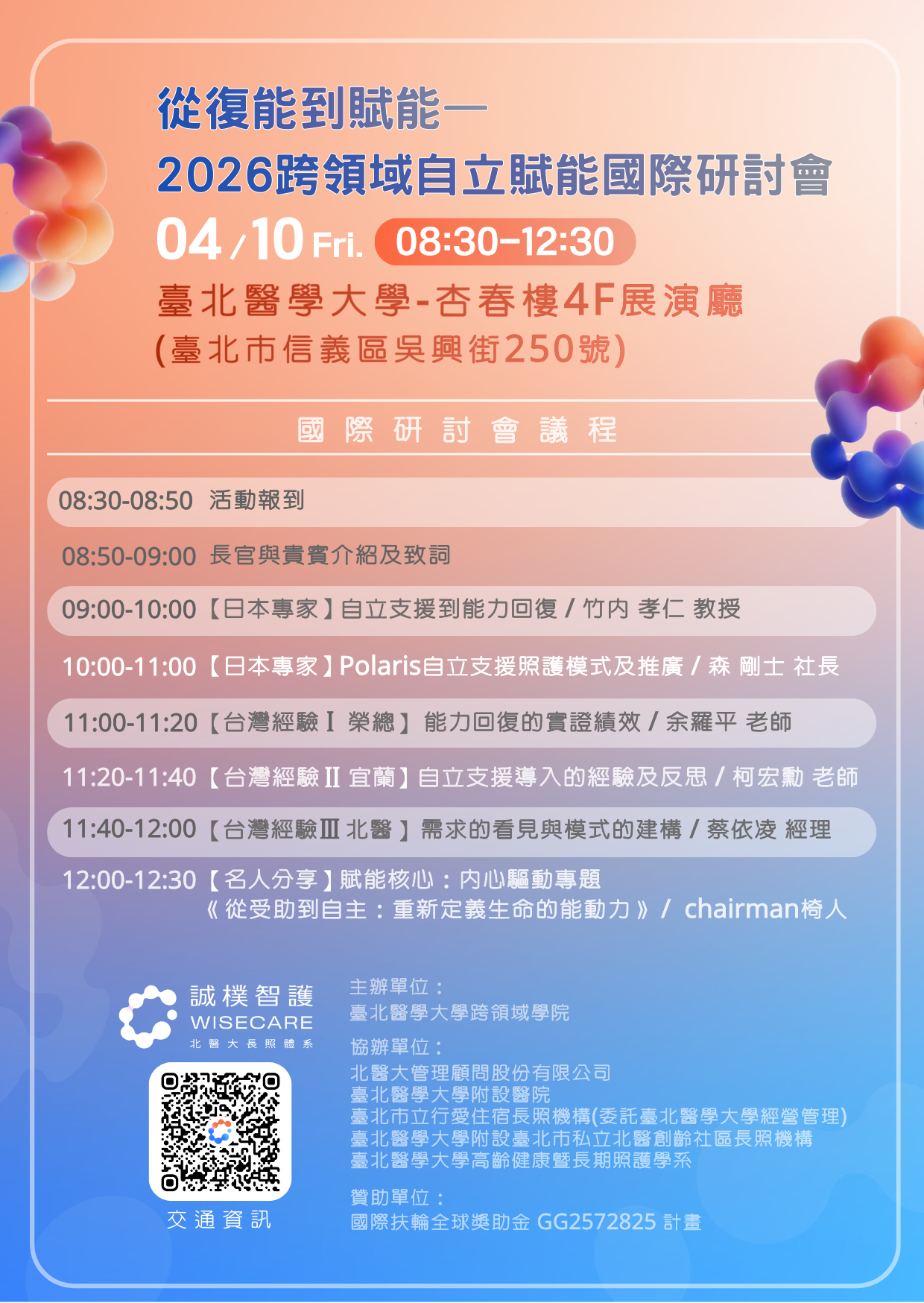 臺北醫學大學體系長期致力於醫學教育與臨床實務整合,積極推動跨領域合作,將醫療、復能與長照服務串聯,落實於社區照護場域。本次「跨領域自立賦能國際研討會」,邀請日本自立支援領域的實務領航者 與台灣專家進行分享,共同探討長照服務從「失能管理」走向「能力重建」的實務策略與未來發展。
