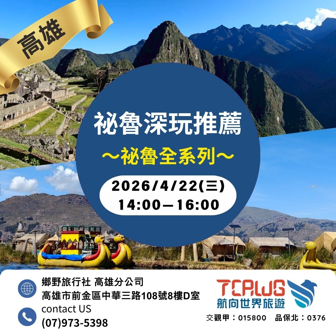 - 講座重點搶先看: 現場將分享 祕魯 馬丘比丘旅遊重點、 安地斯山脈 壯麗景觀、 最佳旅遊季節與行程安排, 帶你深入了解這條經典南美旅行路線。
