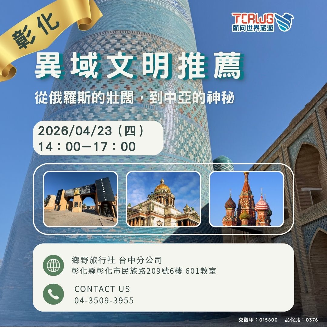 - 講座重點搶先看: 現場將介紹 俄羅斯 城市文化亮點、 中亞 絲路古城魅力、 最佳旅遊季節與行程規劃, 幫助你掌握這條壯闊的歐亞旅遊路線。