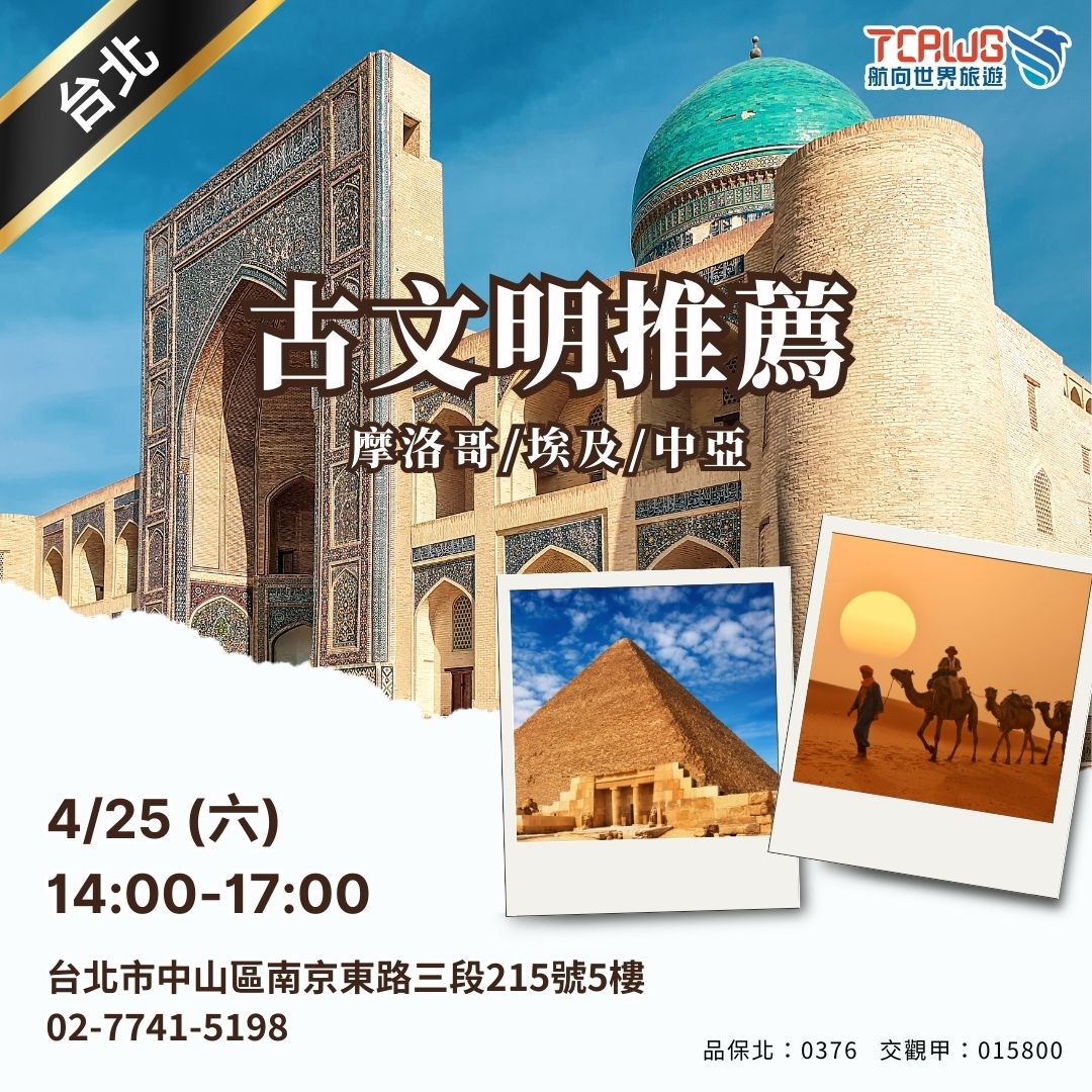 - 講座重點搶先看: 現場將介紹 埃及 金字塔文明、 摩洛哥 古城文化、 中亞 絲路古城, 以及最佳旅遊季節與行程安排, 幫助你快速了解這條經典的古文明旅行路線。