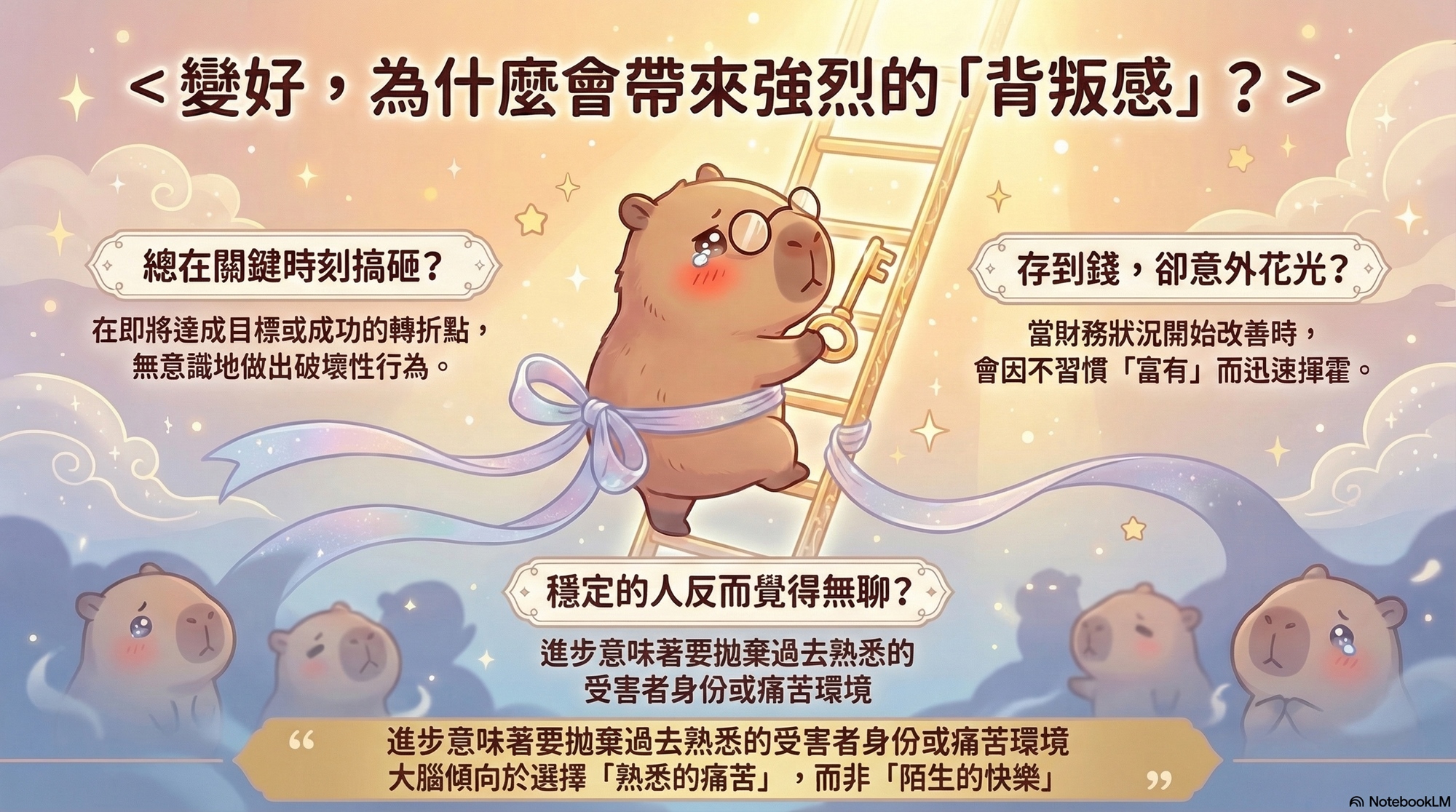 破解「變好的內疚感」:理解為什麼幸福會帶來恐懼,放下對原生家庭與過去自己的無意識背叛感。
