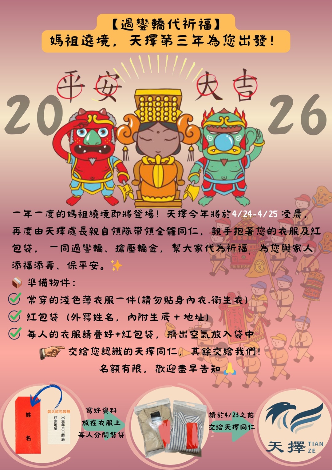 🌿【 過鑾轎~代祈福,媽祖遶境,天擇第三年為您出發! 】 ✨一年一度的媽祖繞境,即將登場!! ✨今年將於2026/4/24(五)~4/25(六)凌晨 ✨再度由天擇處長親自領隊帶領全體同仁 ✨親手抱著您的衣服及紅包袋 ✨一同過鑾轎,搶壓轎金 ✨幫大家代為祈福,為您與家人添福添壽,保平安!!