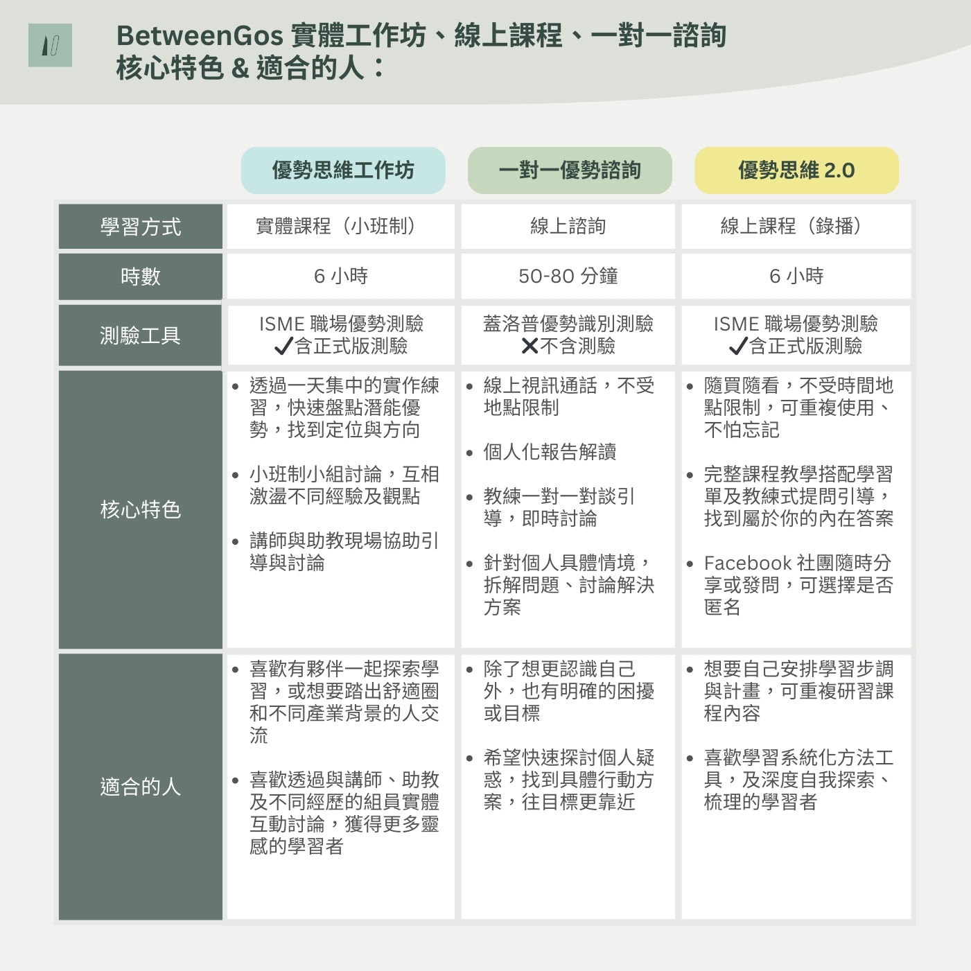 Q1:如果我已經上過《優勢思維 2.0》線上課程,我適合參加實體工作坊嗎?