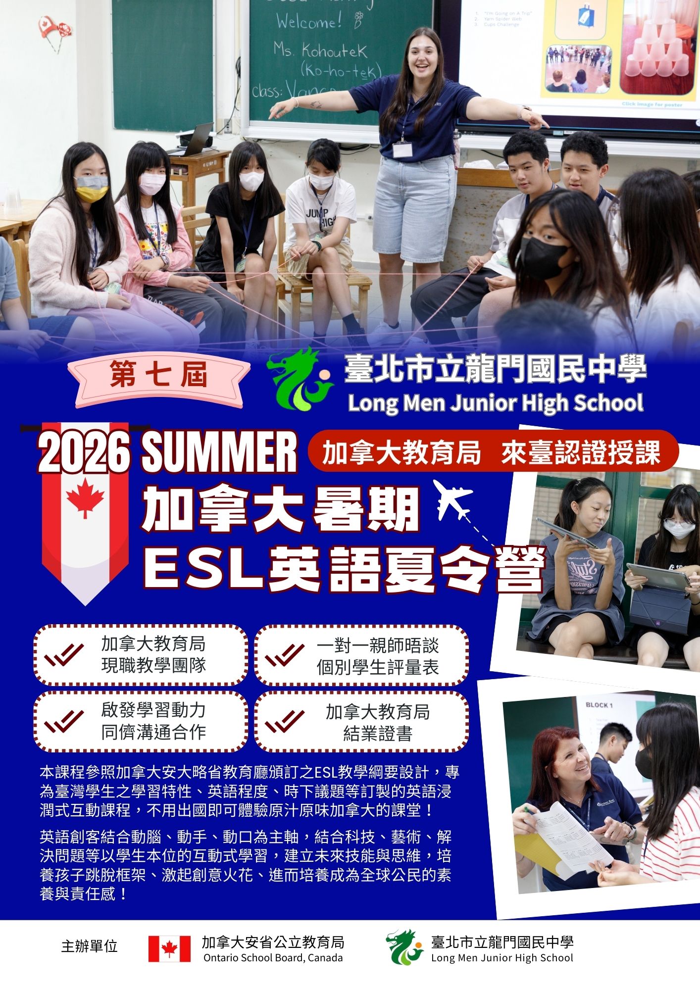 臺北市龍門國中今天邁入第七屆與加拿大教育局首度辦理暑期ESL英語夏令營,國際教育資源正式進入校園!