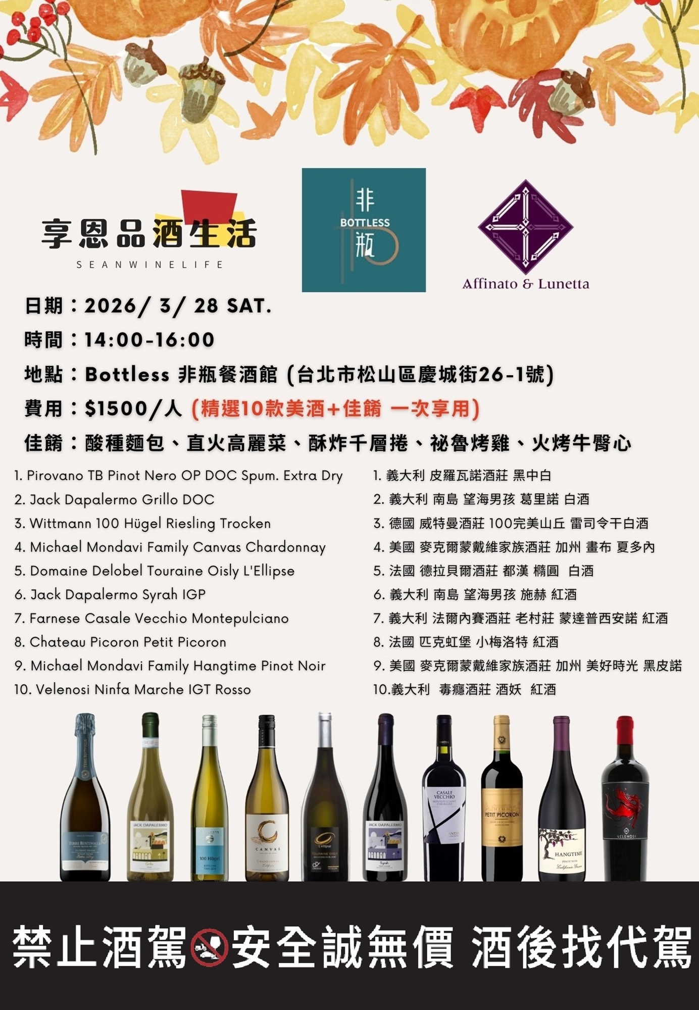 3/28|享恩品酒 x Bottless非瓶 美酒佳餚派對
