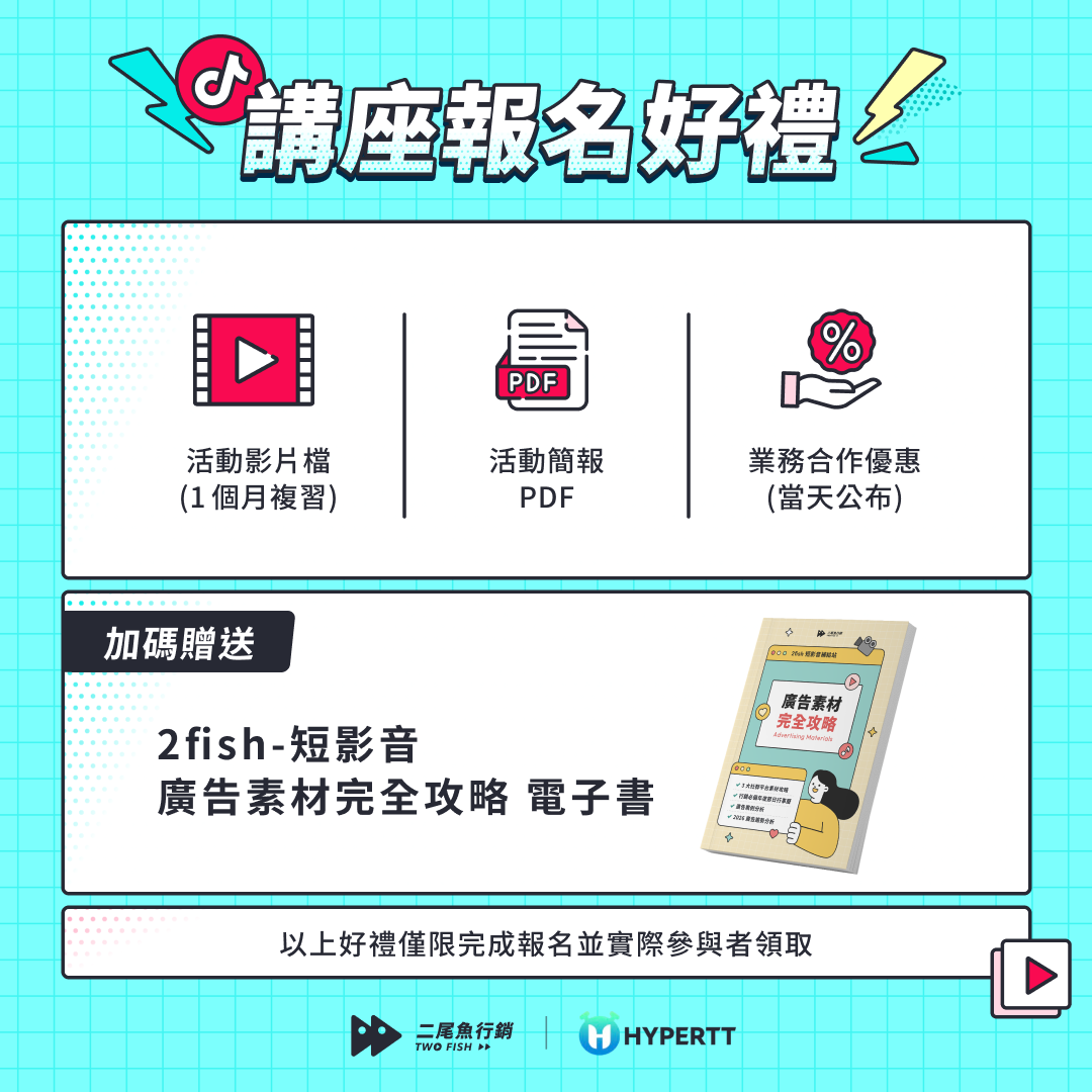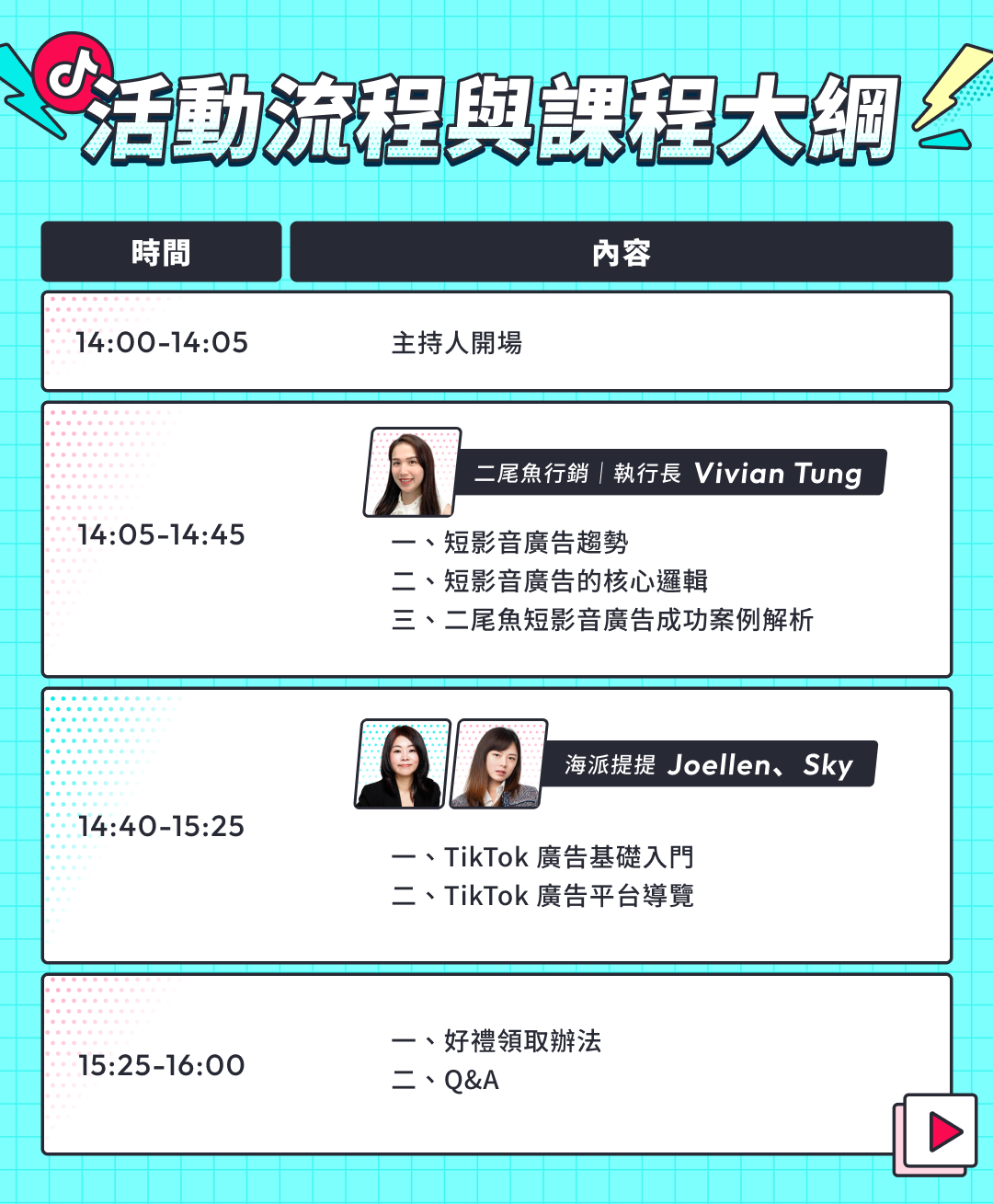 這場講座將從「短影音廣告內容策略」到「TikTok 廣告投放操作」完整拆解,帶你理解短影音廣告背後的核心邏輯,並透過實際案例分享,幫助你建立可操作的行銷思維。