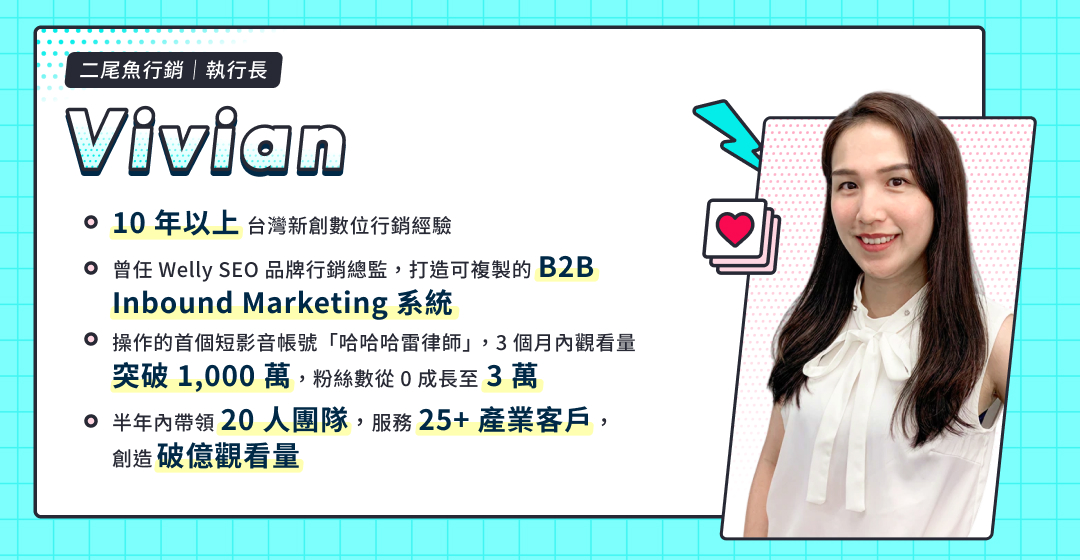 - 曾任 Welly SEO 品牌行銷總監,打造可複製的B2B Inbound Marketing 系統。