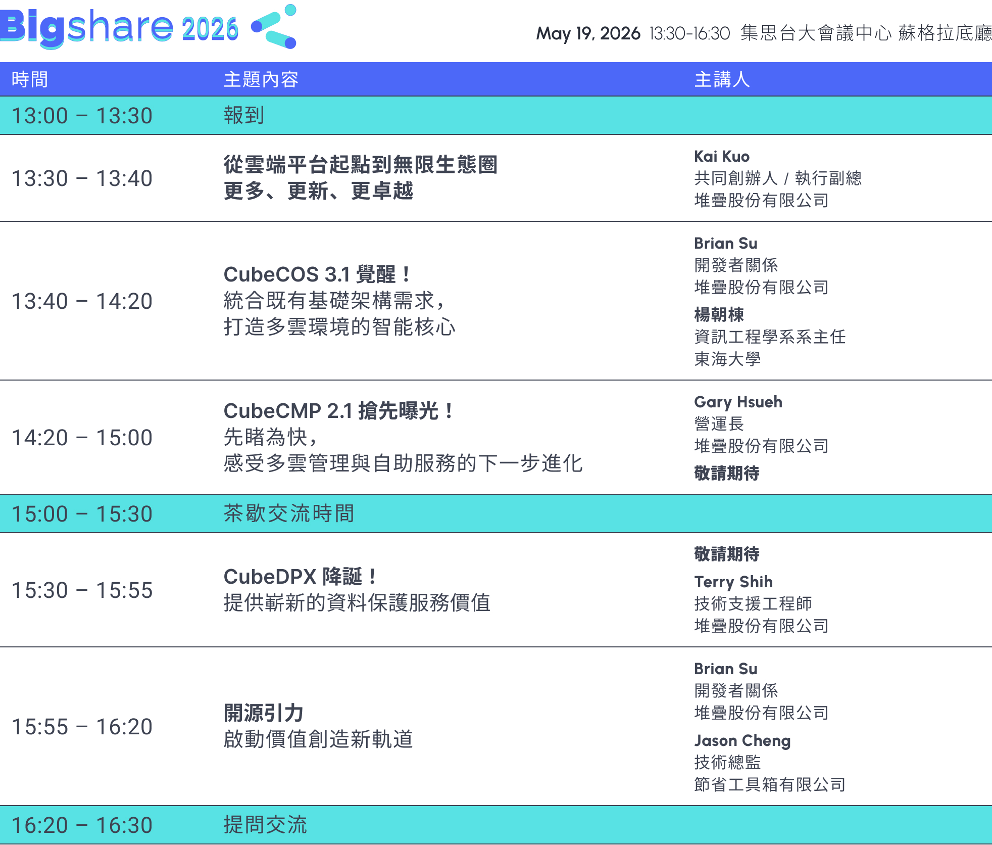 今年 Bigshare 2026 將承接過去的成果,展示 CubeCOS 3.1 的最新功能與應用,並預告 CubeCMP 2.1、CubeDPX 等全新能力,透過真實案例分享與專業討論,從學術場域到規模企業一次看懂如何運用雲原生平台提升運行效率與服務彈性。