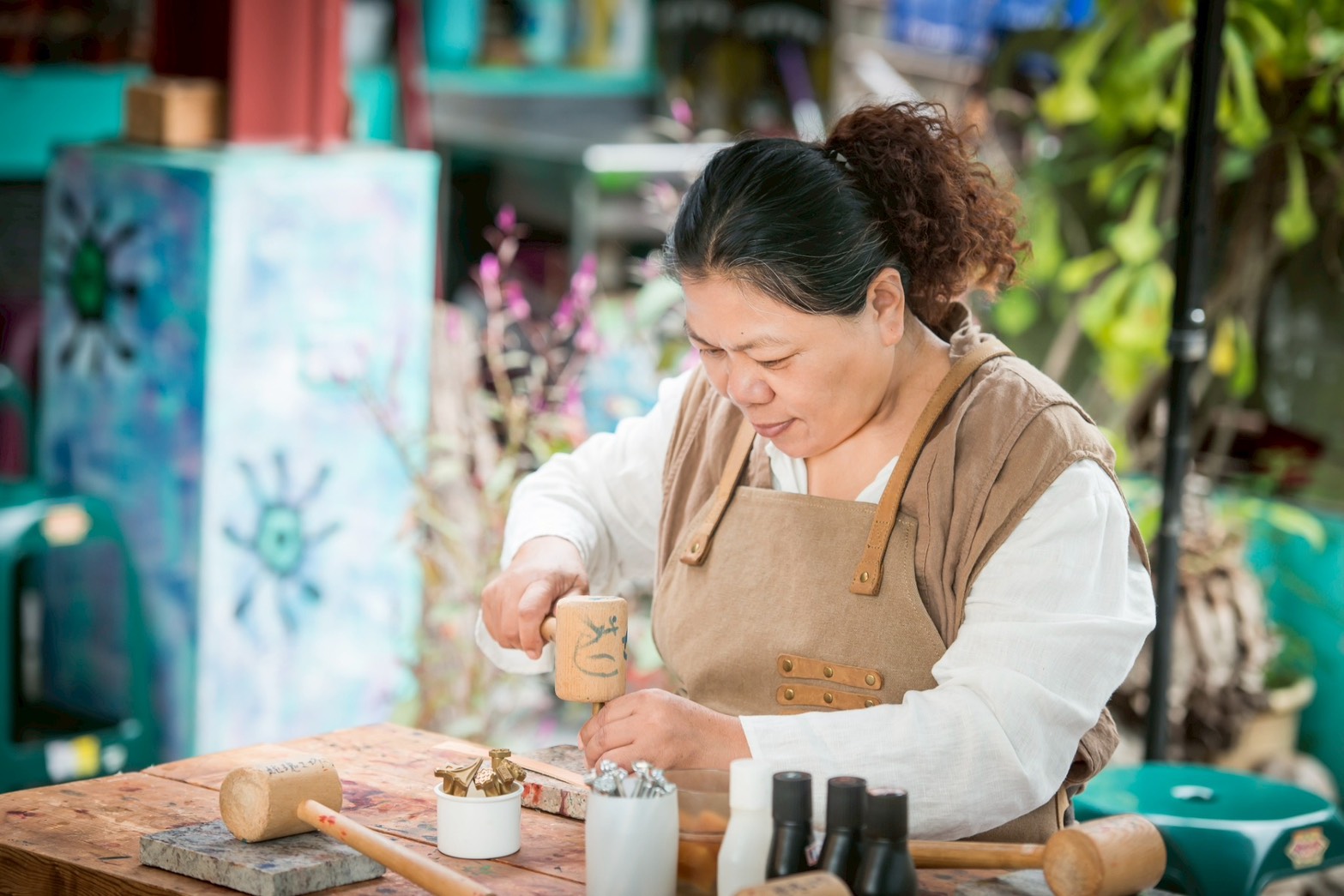 姥瑰老師一筆筆將圖紋刻印在皮革上,希望文化不只停留在記憶裡,而是走入日常生活中。