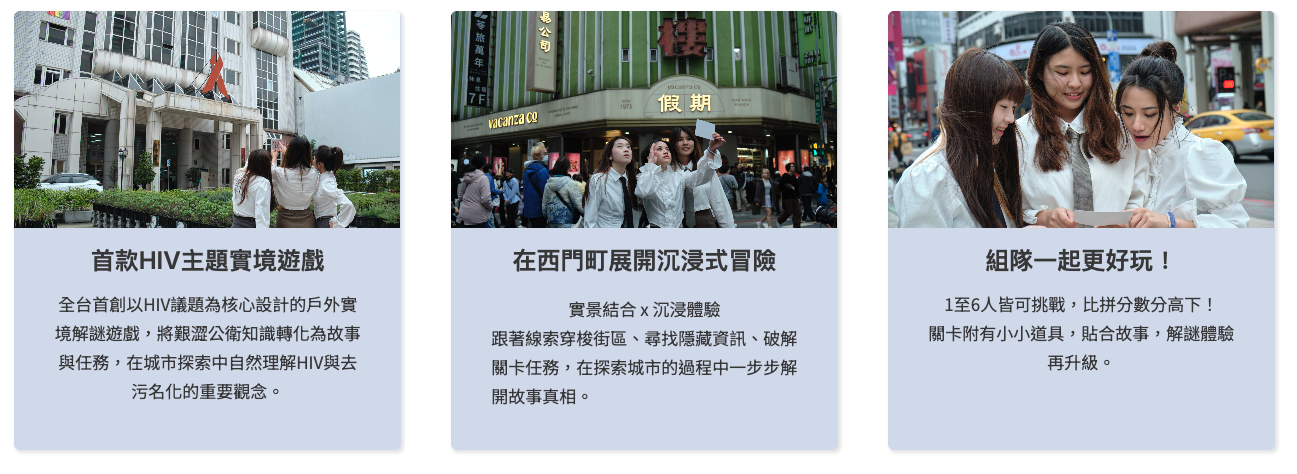 本計畫透過戶外實境解謎遊戲的形式,讓街道巷弄化身為關卡,用創新方式打造實境遊戲,帶領參與者深入了解「U=U」、去污名化等概念知識,期望改變社會對HIV感染者的既定印象與偏見,並期作為教育體系之應用教材。