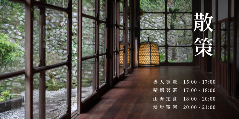 晚宴嚴選當季風土食材入菜,呈現山海交織的旬味料理。在市定古蹟的優雅氛圍中,我們以「食藝體驗」為核心,呈現一場連結風土與味蕾的深度對話。這不僅是一場私人款待,更是為入夜後的賞螢之旅預作準備,讓精緻的旬味在舌尖綻放,隨後展開悅人的星螢盛會。