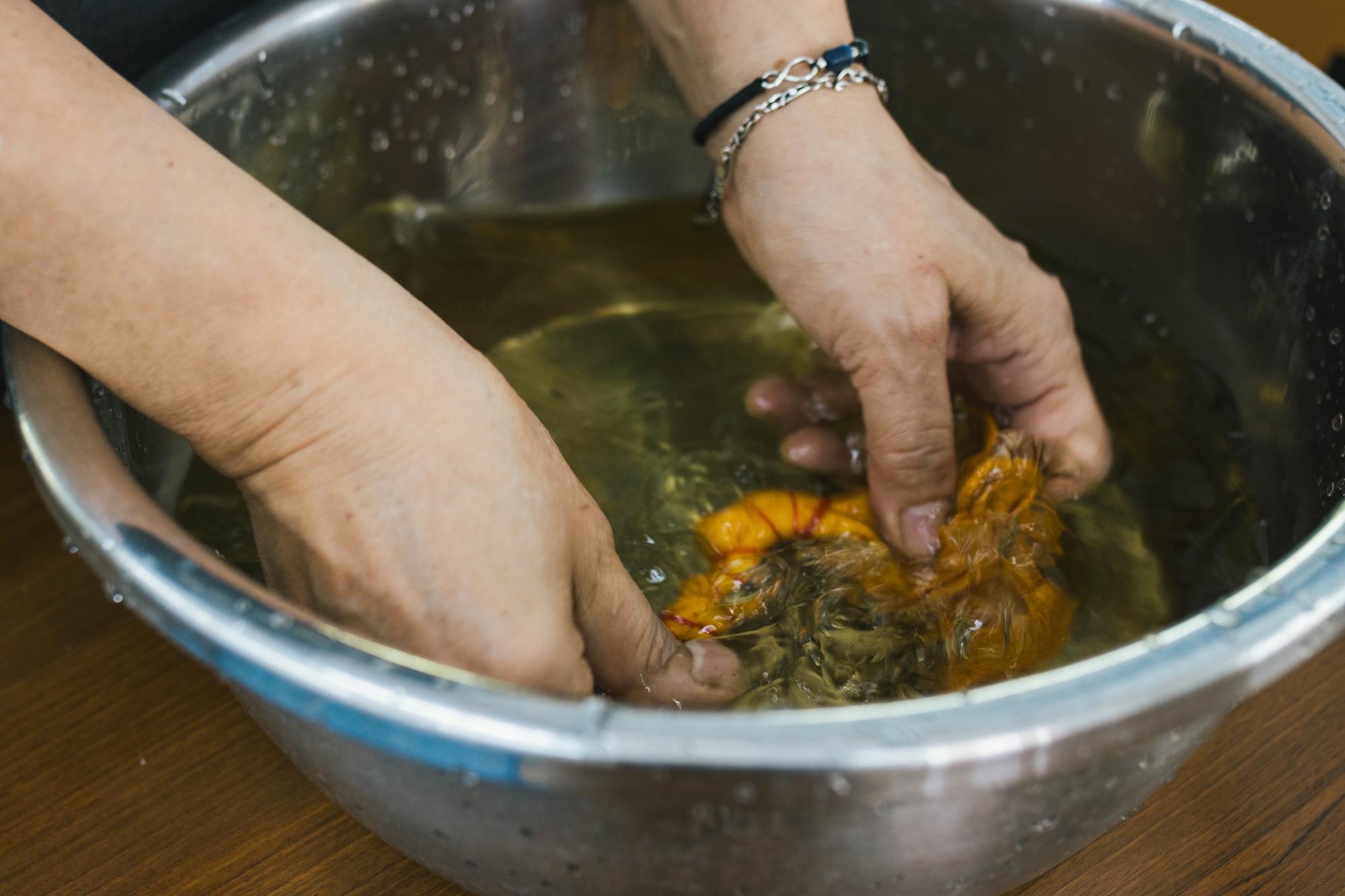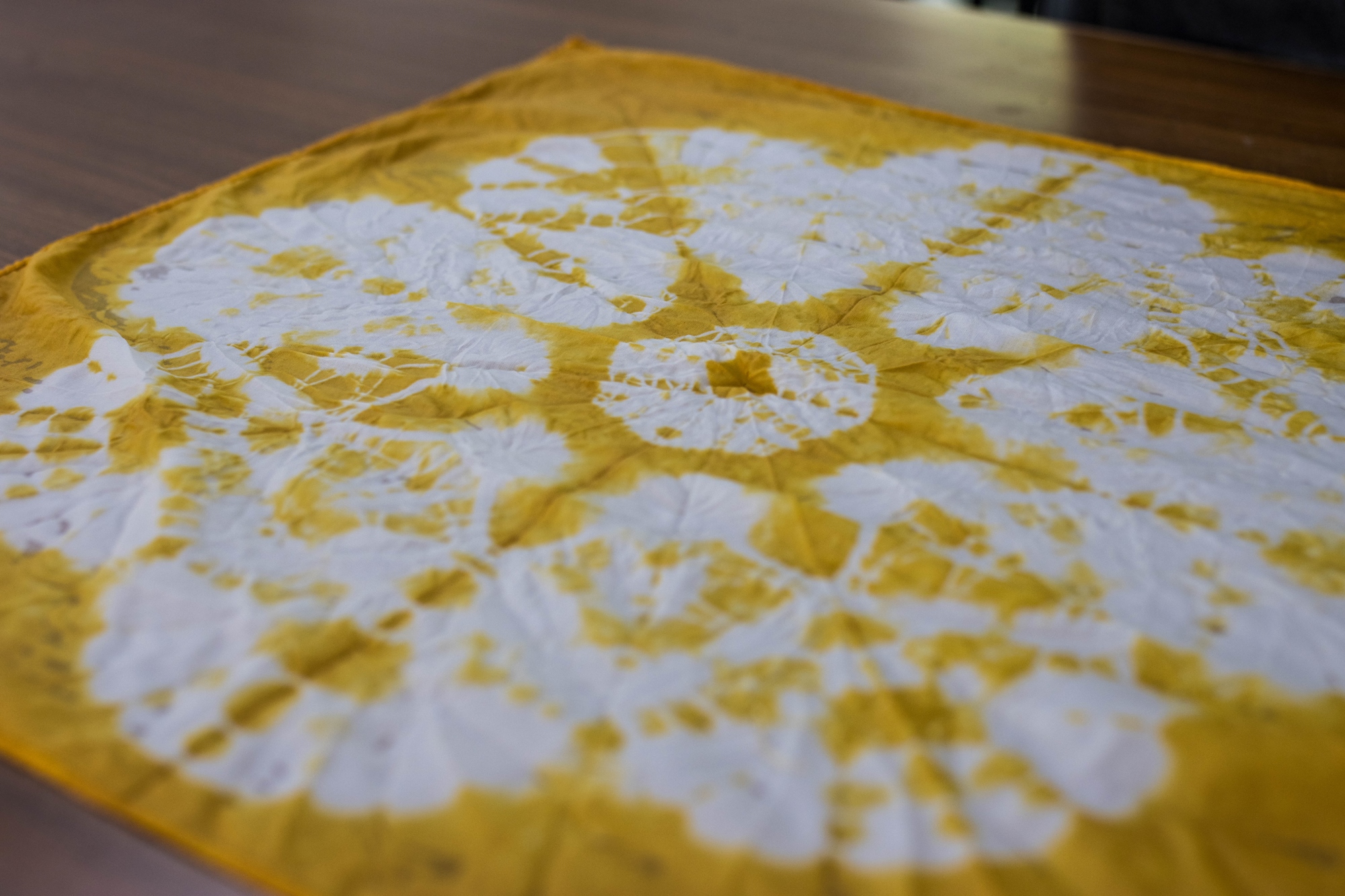 從純棉手帕開始,透過摺疊、綁紮與固定,讓布料在染色時產生不同的阻染效果。當顏色慢慢滲入、交錯,最後解開繩子的那一刻,圖案才真正出現,每一次都不會一樣。