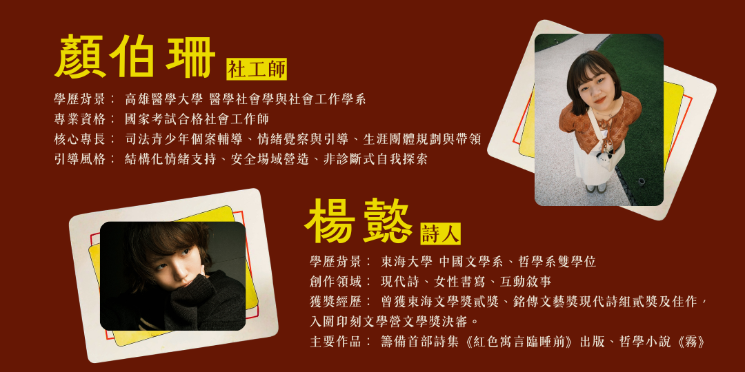 文字轉譯|楊懿 詩人 擅長捕捉生活中微小而精確的詩意。她扮演「感受的譯者」,協助參與者將抽象的直覺轉化為具備溫度的文字力量。