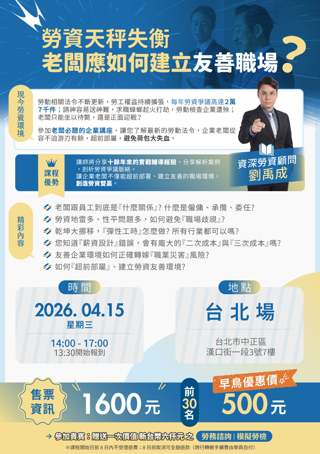 凡參加就送 價值 NT$6,000 之【勞務諮詢|模擬勞檢】乙次