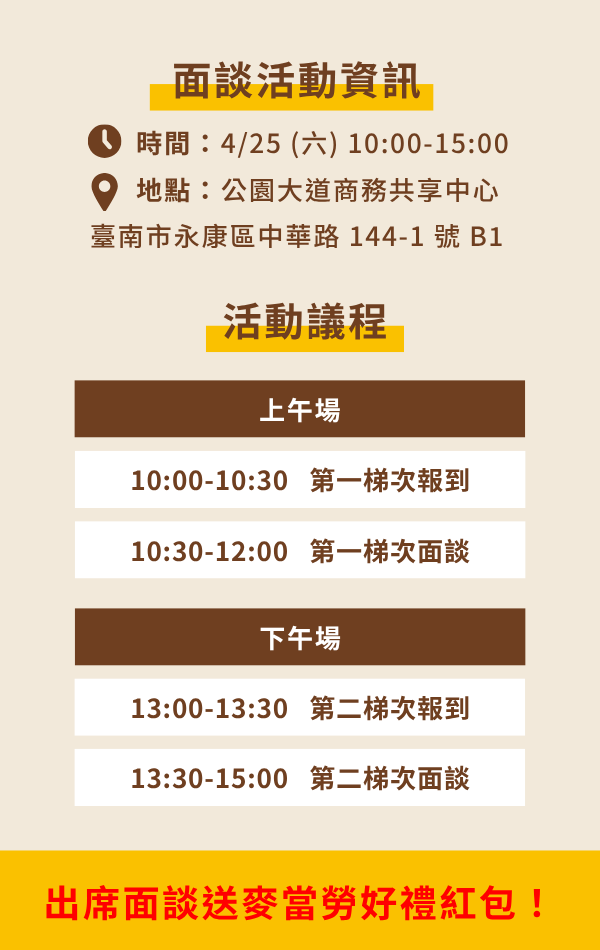 報名參加 餐廳儲備幹部 台南場面談,符合資格者現場錄取!還可領取麥當勞好禮紅包,大大加速你的職涯旅程 🚀 誠摯邀請想成為餐飲儲備幹部的你加入!