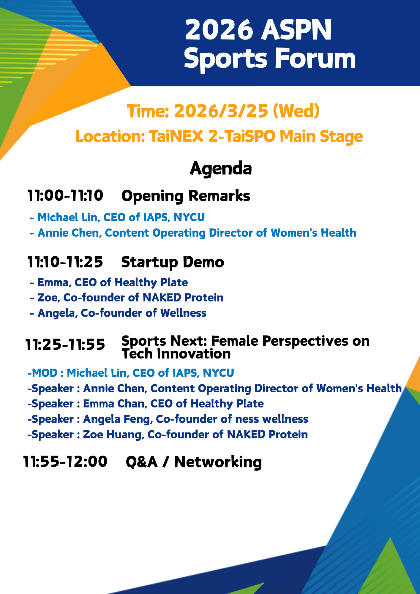 - Venue: Main Stage, 2026 TaiSPO (Taiwan International Sports and Fitness Show)Taipei Nangang Exhibition Center, Hall 2 (TaiNEX 2)