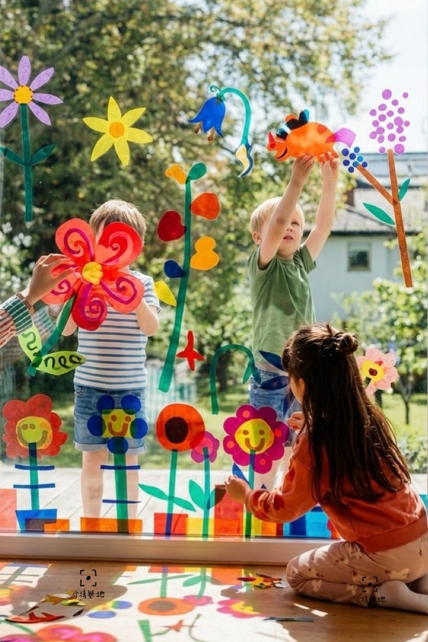 在活動中,孩子可以自由拼貼各種花葉造型,運用透光材質,在玻璃牆面上堆疊出屬於大家的花園。隨著光線灑落,顏色與圖案會不斷變化,讓作品不再只是平面,而是一個會呼吸的空間。