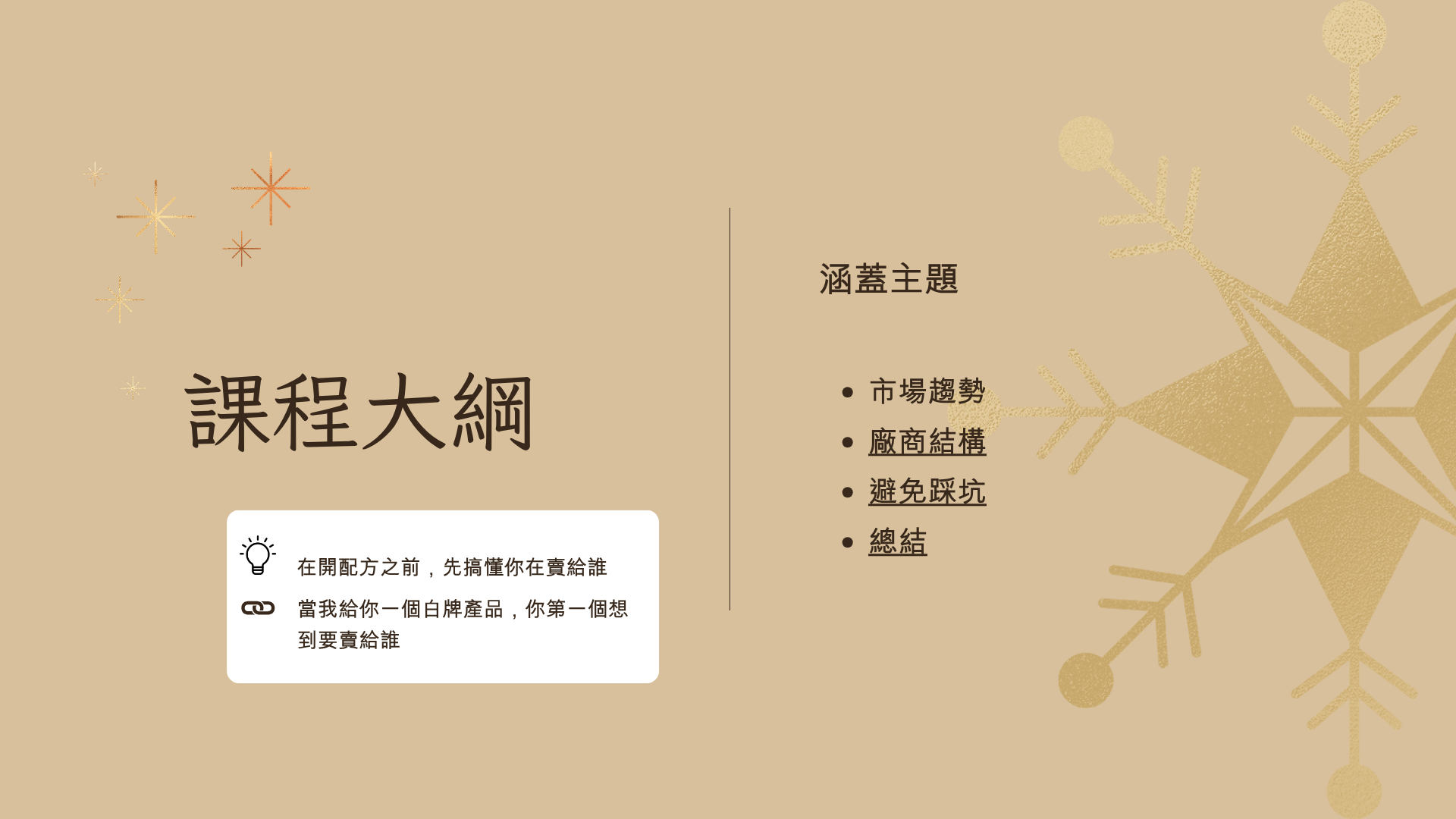課程分享我從入行10年後的市場判斷、產品開發核心、真實的廠商溝通互動、到法規哪些才是重點,保障清清楚楚鉅細靡遺地講清楚