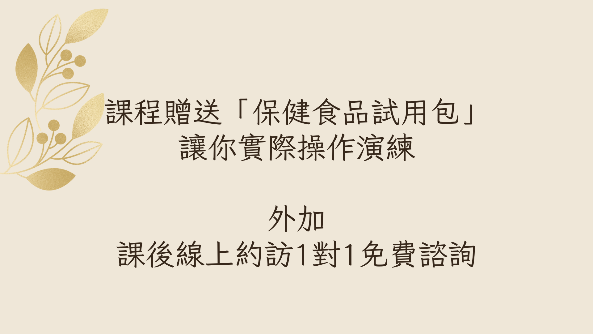 【適合對象】 想打造自有保健食品品牌的KOL、企業主、電商經營者、健身教練及創業者,或是想了解更多保健食品上游領域的你