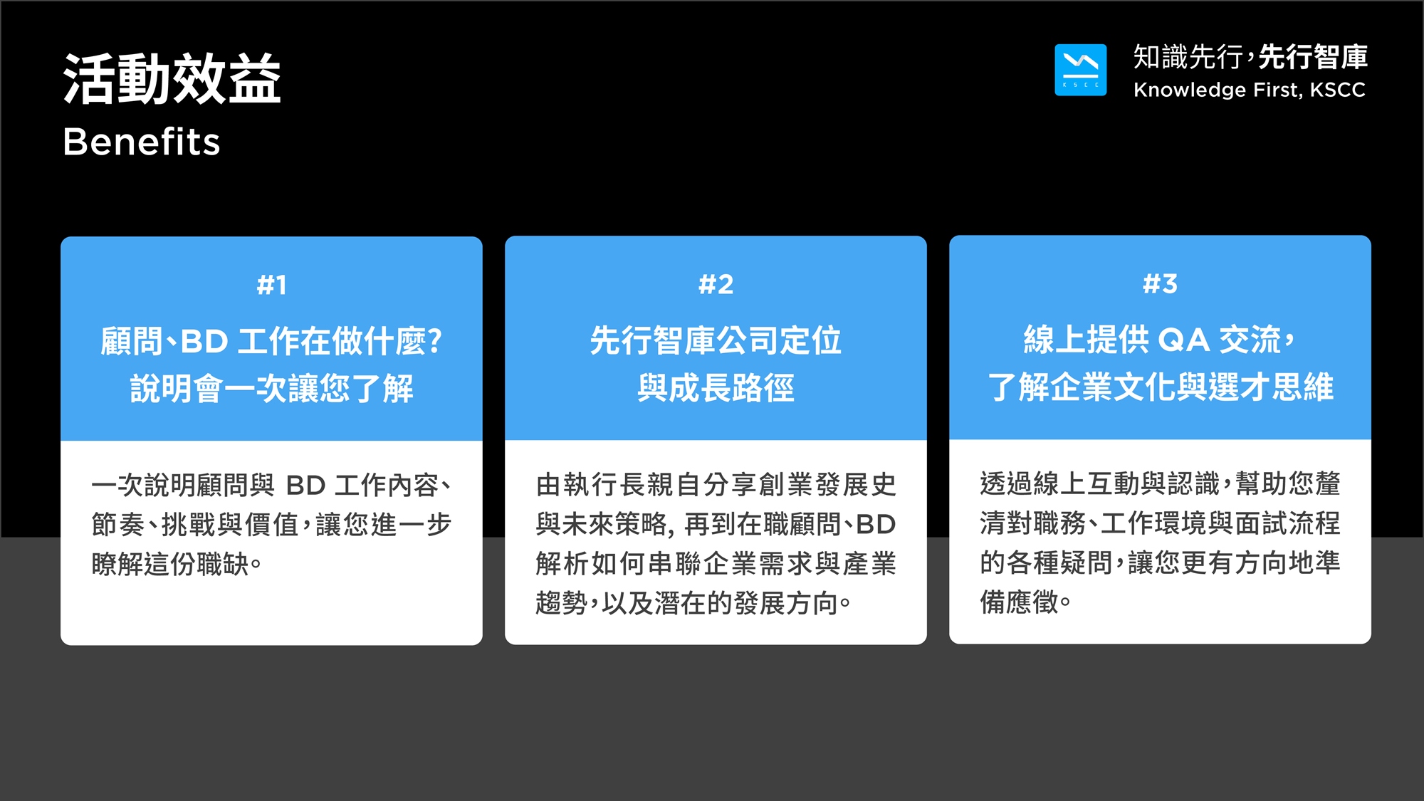 你對流程自動化或數據分析懷有熱情嗎?想了解科技管理顧問公司的 BD 團隊是如何經營客戶?先行智庫誠摯邀請您參加本次「顧問」與「BD」的招募說明會。 本次活動將由先行智庫創辦人兼執行長蘇書平 Steve 親自分享,讓您深入了解顧問與BD的工作日常、職涯發展藍圖,以及我們在挑選與培養團隊成員的思維。2025年預計僅開設一場,立即報名!
