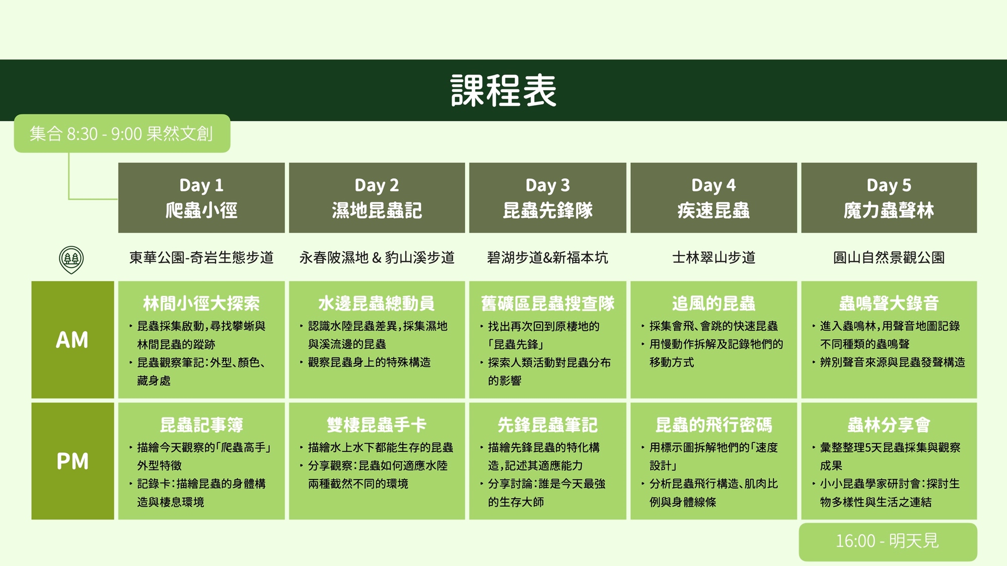 - 自行前往果然文創(8:30-9:00集合),並於果然文創放學自接(day 1)(16:00下課,17:00後酌收延托費$200/h)