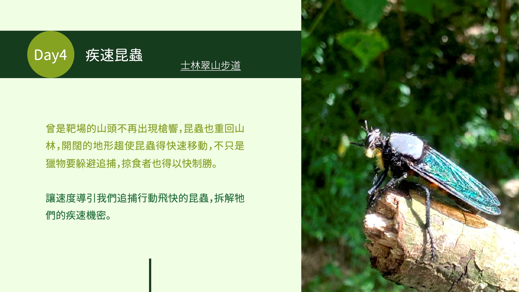 昆蟲遍佈在城市周圍的森林裡,佔據濕地、草叢與林地,在樹梢與落葉間穿梭生息。讓我們手拿昆蟲網,帶著筆記本,細心觀察牠們的形態與行為,記錄台北蟲林裡的生態故事,發現微小生命背後蘊藏的奧秘與驚奇。