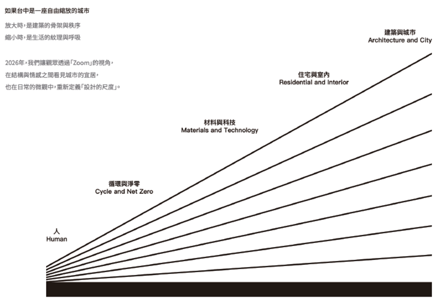 以「Zoom/尺度轉換」為核心概念,象徵從「人」出發,透過尺度的轉換與設計的延展,最終構築出屬於未來的建築與城市樣貌。
