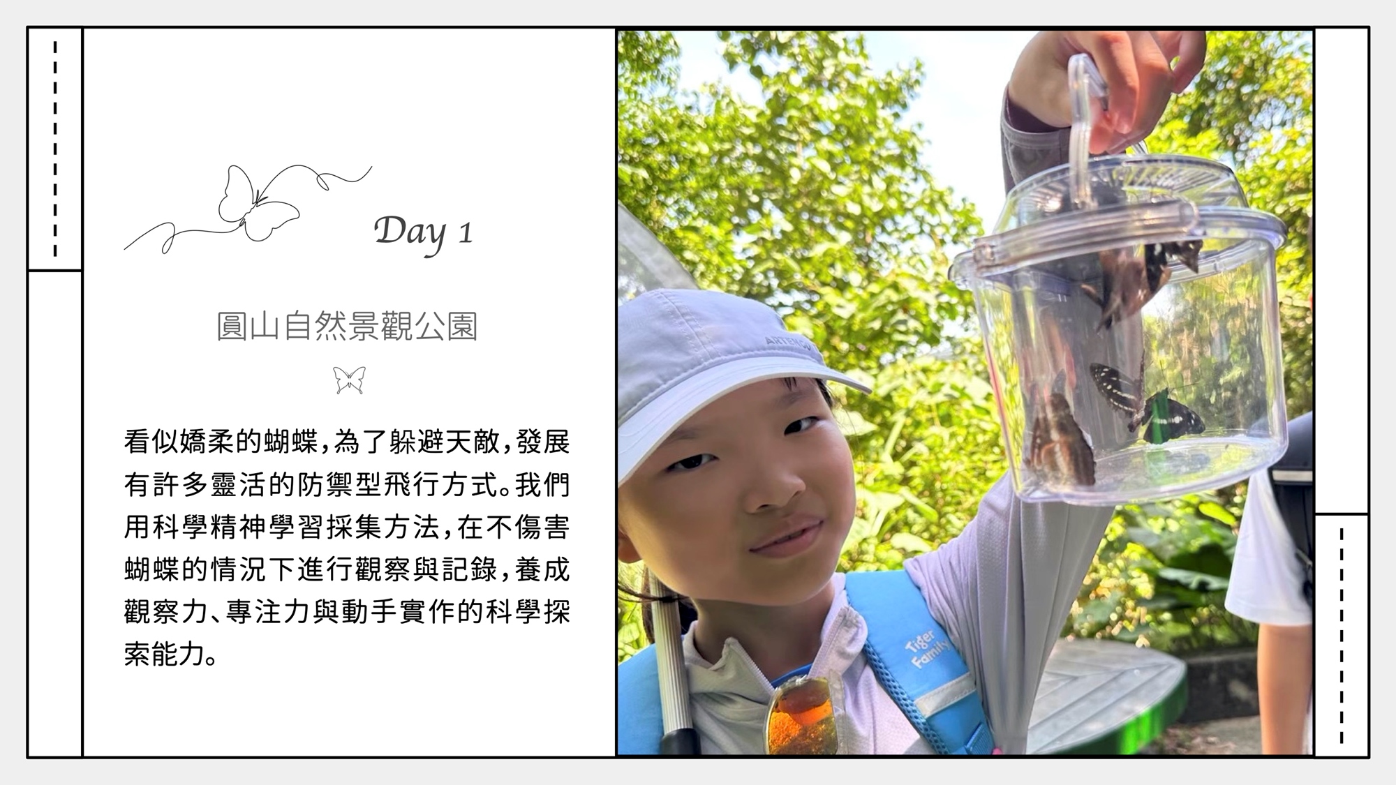 在三天的探索中,孩子將學習觀察蝴蝶生態、辨識翅膀特徵與不同種類,並透過比較與記錄,初步認識昆蟲分類的方法。過程中培養細心觀察、專注思考與主動提問的能力,讓自然探索成為今夏難忘的學習體驗。