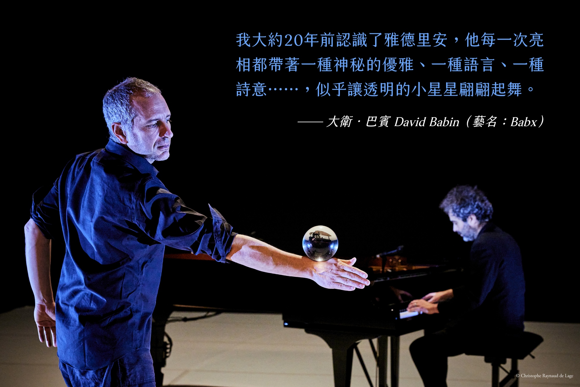 兩位藝術家帶著各自走過的創作歷程,在相遇20年後找回藝術的初心,重拾當年做著白日夢、實驗與演奏的樂趣與激情,大衛.巴賓暫卸歌手身分,以鋼琴獨奏演繹音樂專輯《一個有鋼琴的房子》多首曲目,曲風橫跨法式香頌、爵士、當代即興等,享譽國際的科技藝術家雅德里安.孟朵以水晶球雜技重返舞台,隨音樂重新感受引力與墜落的瞬間。