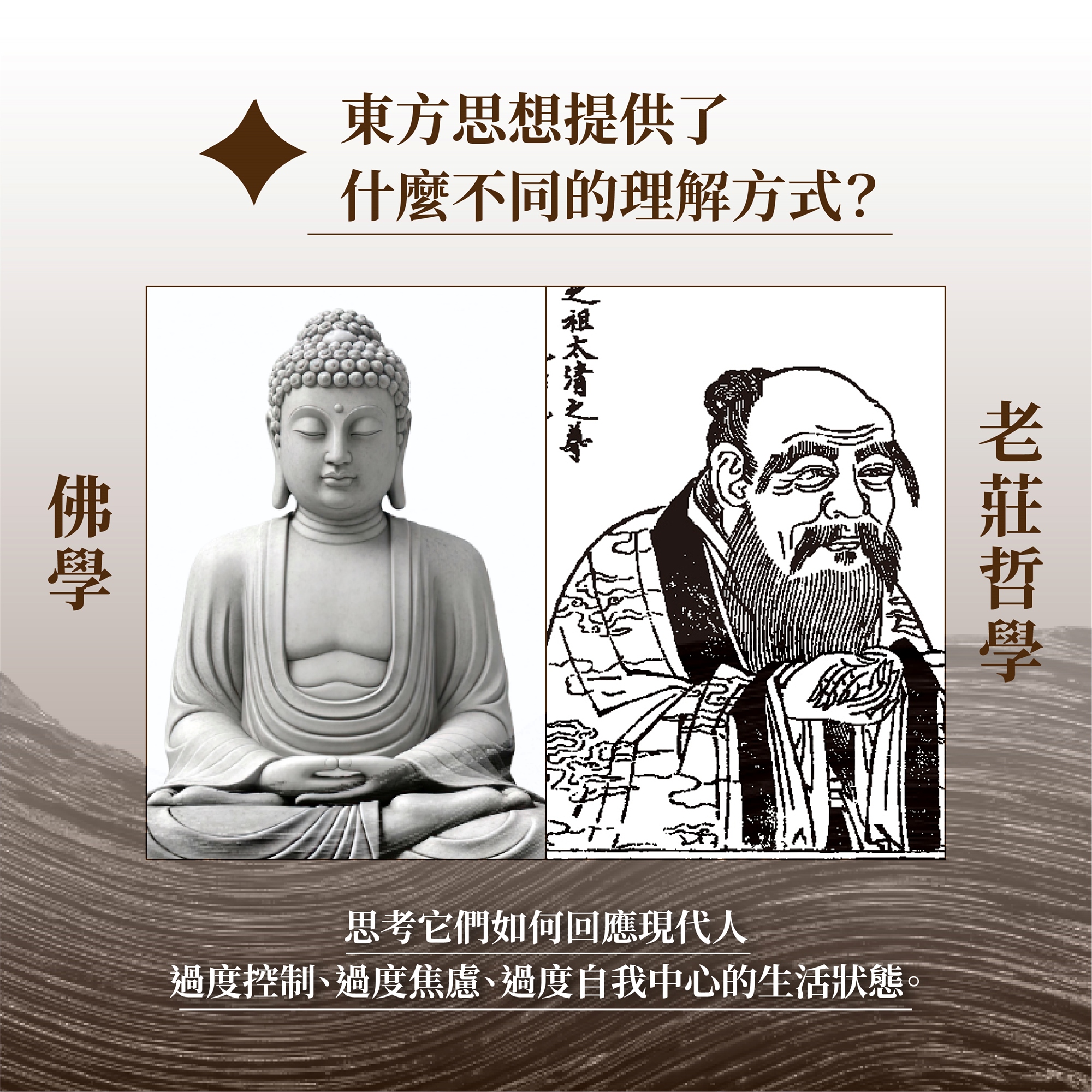老莊對「有為」、「知識」、「控制」提出根本質疑,指出人對世界的掌握往往來自執著與錯置;佛教則透過「無我」、「緣起」、「空性」重新處理「自我」與「認知」的問題——不是否定世界,而是指出我們如何在認知中構造世界。