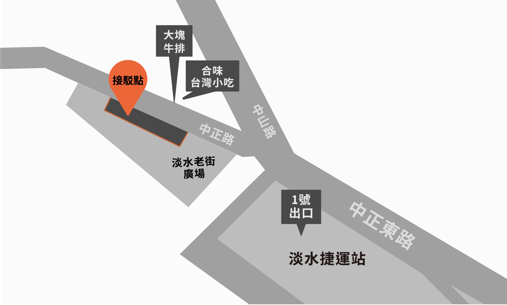 - 免費接駁車: 淡水捷運站 1 號出口,步行約 5 分鐘至接駁點搭乘,請詳下圖 。 (接駁時間:09:15 - 09:45,最後一班將於 09:45 發車,請留意時間)