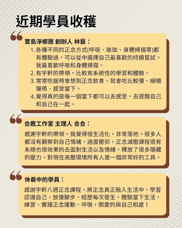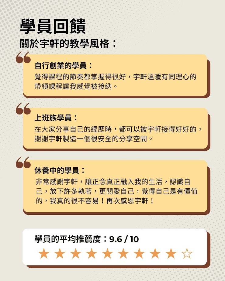 宇軒的正念課程獲得學員平均 9.6 分 (滿分 10) 的極高推薦。