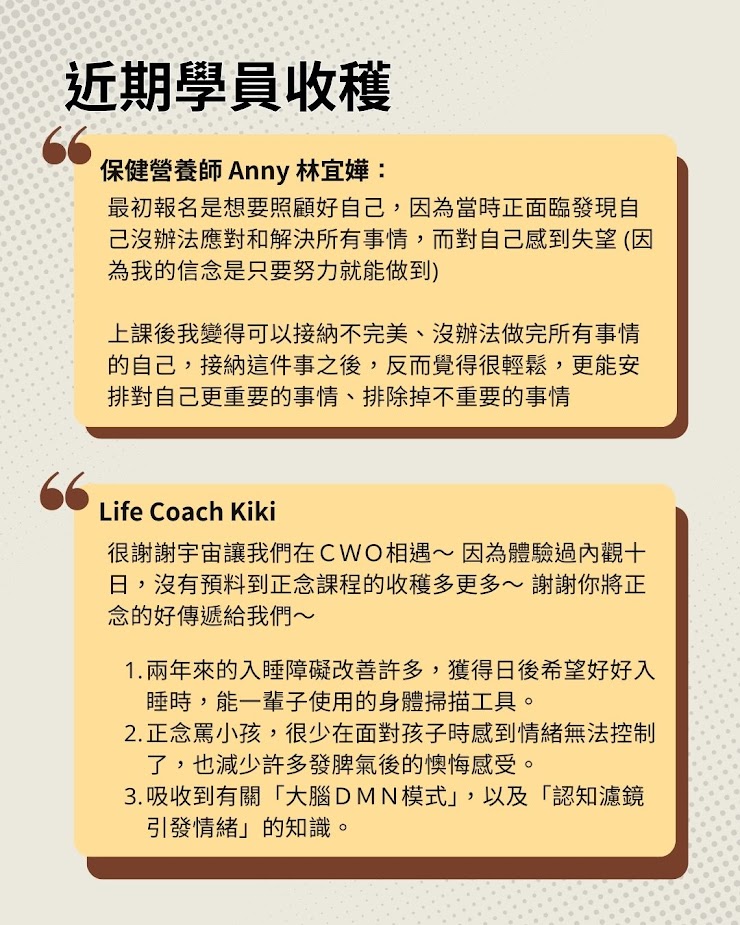 - 擔任 美國加州【美中心理】正念減壓 進階師資培訓 助教