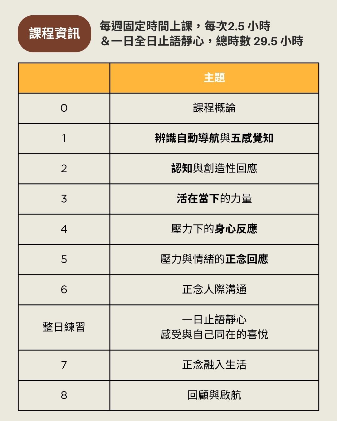1. 共 29.5 小時實體課程(每週 2.5 小時,共 9 週,含第一週當代正念課程介紹&一日止語靜心體驗)