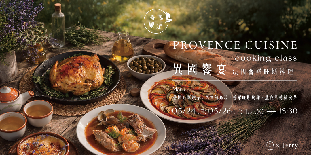 在這堂課中,我們將循著南法的陽光與香氣,一起走進普羅旺斯的餐桌。從花田到廚房,讓香草、蔬果與海風交織,慢慢烹調出屬於普羅旺斯的浪漫風味。