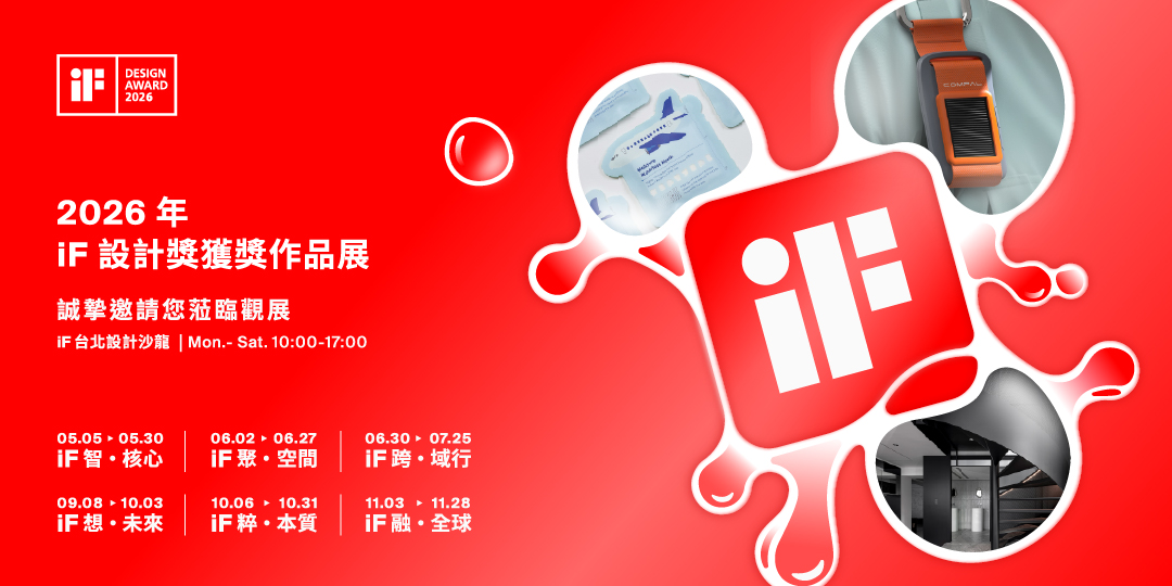 2026年iF設計獎台灣獲獎作品系列宣傳活動4月起將在「 iF台北設計沙龍 」盛大展開!我們將以3場系列講座及6檔主題展覽帶您一探今年來自台灣與全球500件獲獎作品的多元風貌,帶您一起聆聽獲獎設計師的創新歷程及看見改變世界的創意現場。