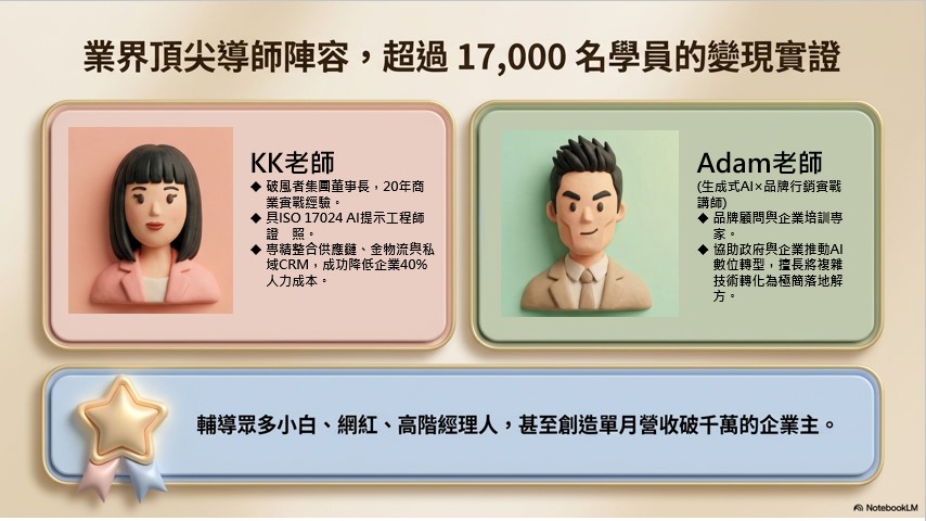 在 AI 浪潮下,一個人就能發揮一支團隊的力量。本課程由**「電商直播培訓教母」KK 老師與 Adam 老師聯手指導,專為 0 基礎學員與想不露臉創業的直播主**量身打造。無需高階電腦,全程僅需一支手機,兩天內帶領你從市場數據分析、視覺素材生產,一路串接到電商收單閉環,將昂貴的外包成本轉化為你的個人核心競爭力。