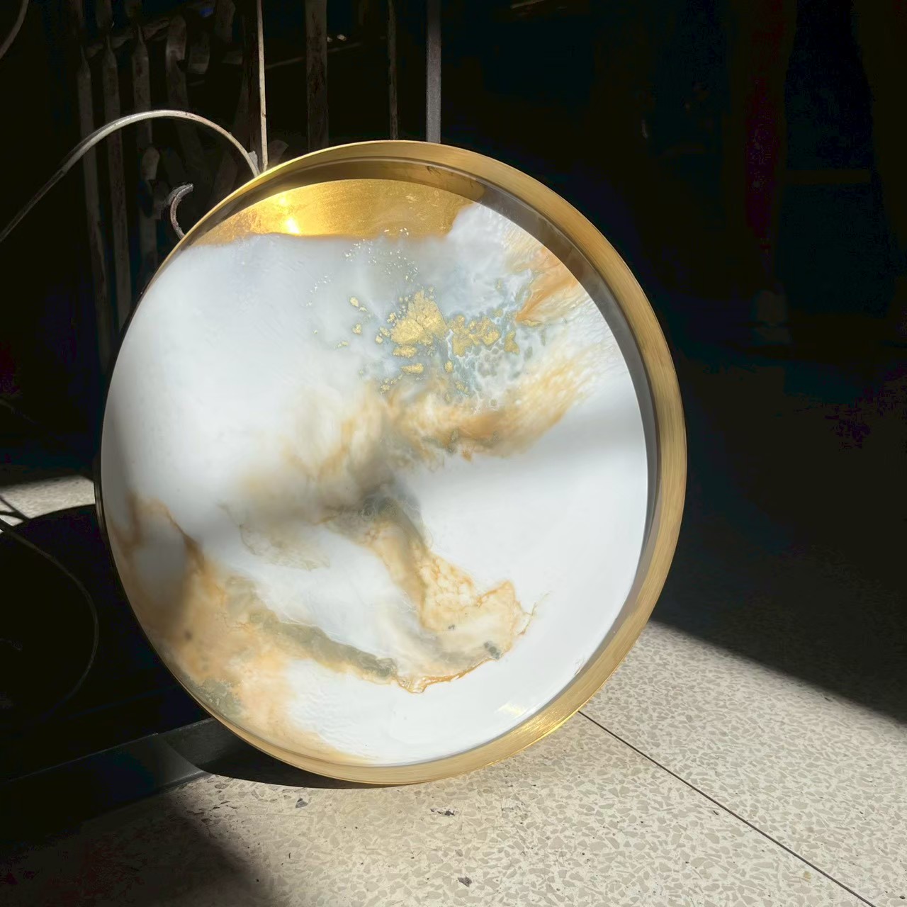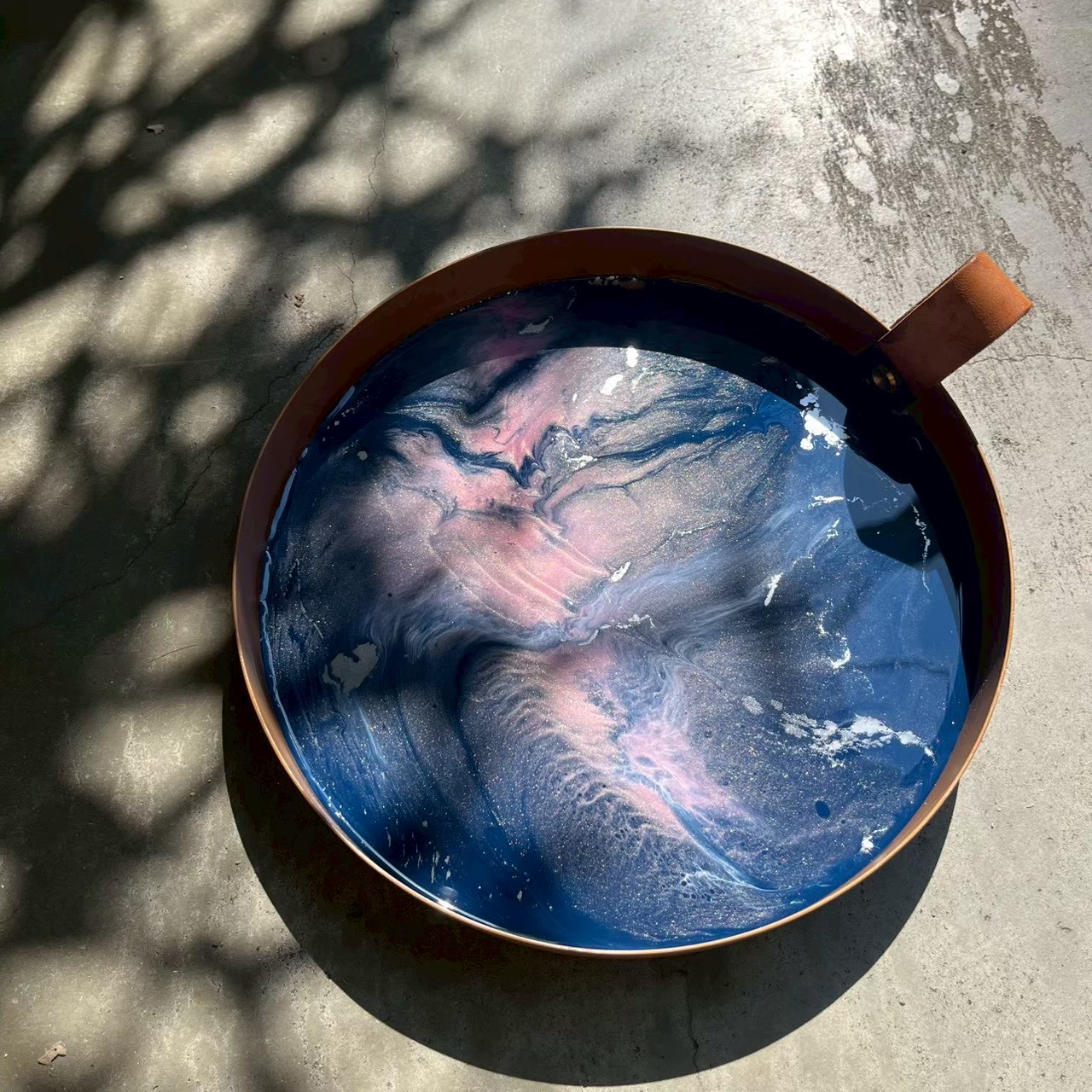 將流體樹脂藝術灌注進圓形盒蓋之中,