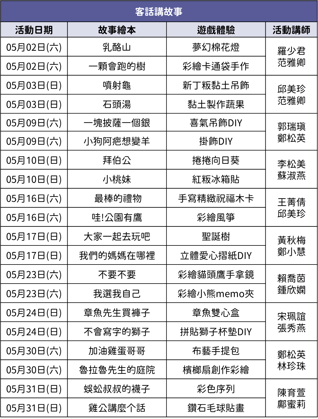 感謝大家的對客話講故事的支持,中心決定繼續為小朋友開設有趣的客話講故事,並嘗試開設上午場次,不只有專業老師講繪本故事給小朋友聽,還會帶些簡單的互動小體驗,每場故事不一樣,還有小禮物可以拿唷!!希望大家能踴躍報名給我們鼓勵,我們會再開出更多有趣的課程,讓大家一起玩樂共學!
