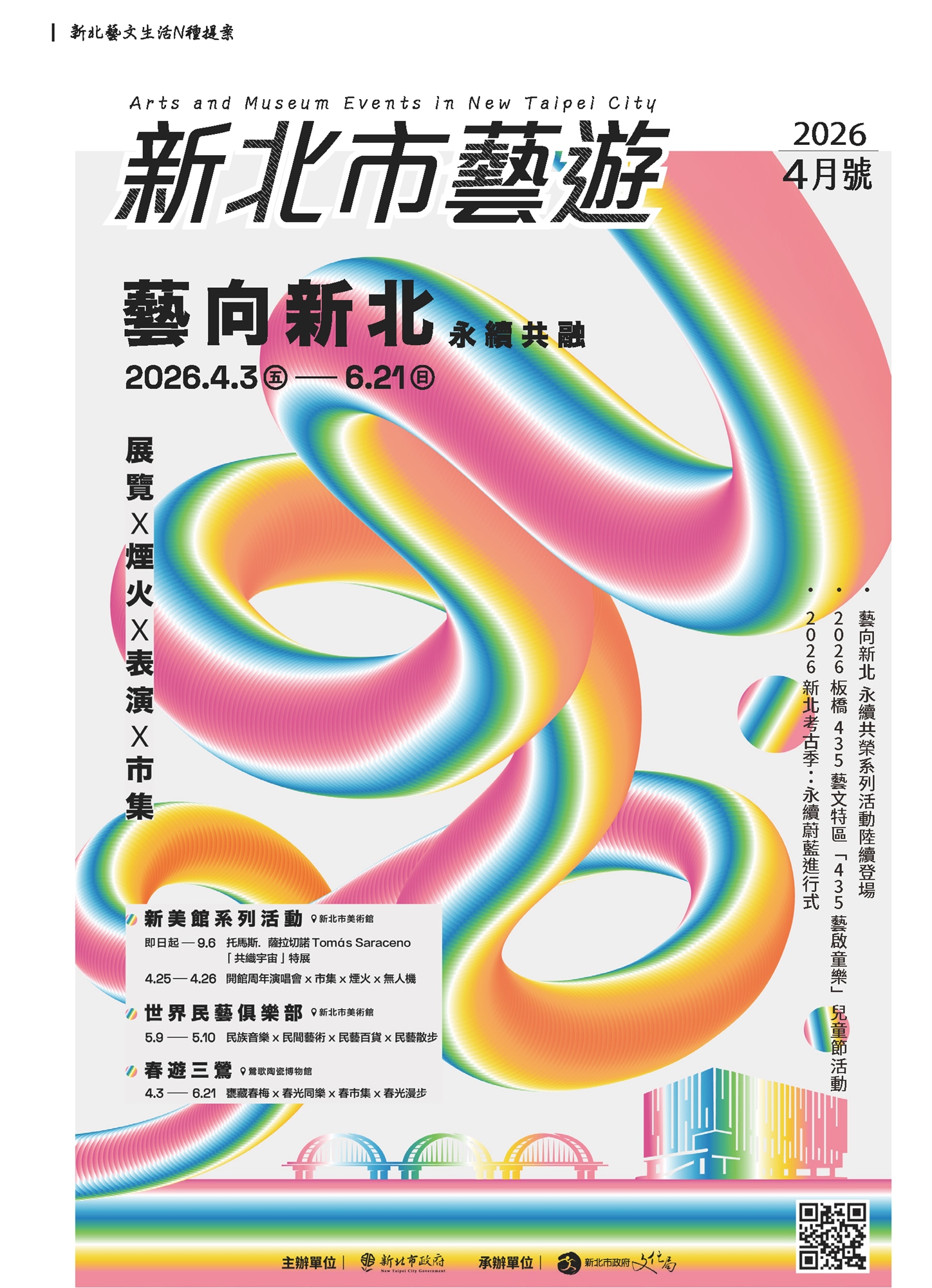 響應三鶯捷運線即將通車,新北市文化局攜手新美館、陶博館於4月至6月推出「藝向新北」永續共融系列活動,以「永續發展」及「多元共融」兩大主軸,陸續推出新美館周年館慶、世界民藝俱樂部及春遊三鶯等活動,邀請市民共同參與。