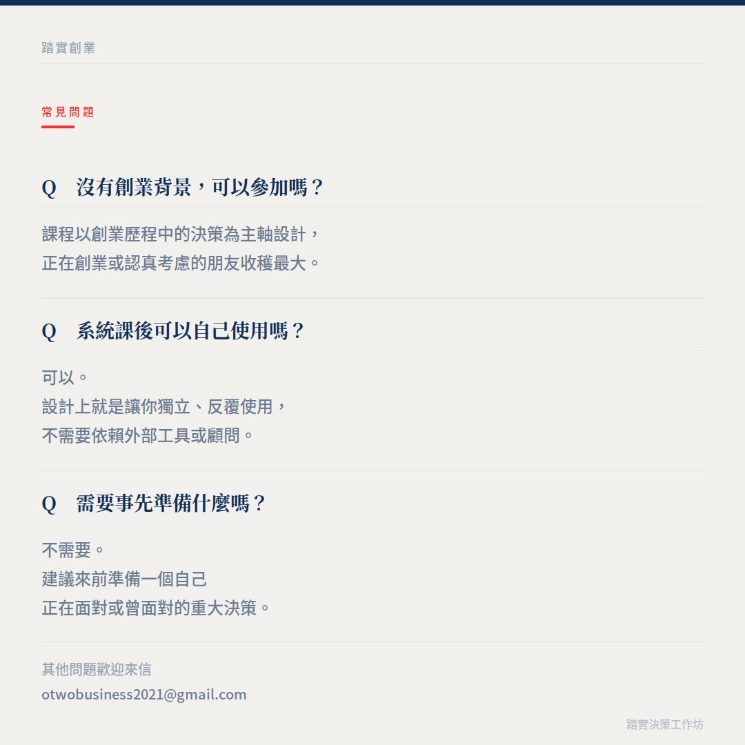 |你是否也曾這樣想?|為什麼現在的創業者更需要這套系統?|這堂課是什麼?|課程結構|你將帶走|這堂課適合誰?|學員怎麼說?|關於講師|常見問題 名額有限,確認席位後即完成報名。 如有任何問題,歡迎來信 otwobusiness2021@gmail.com