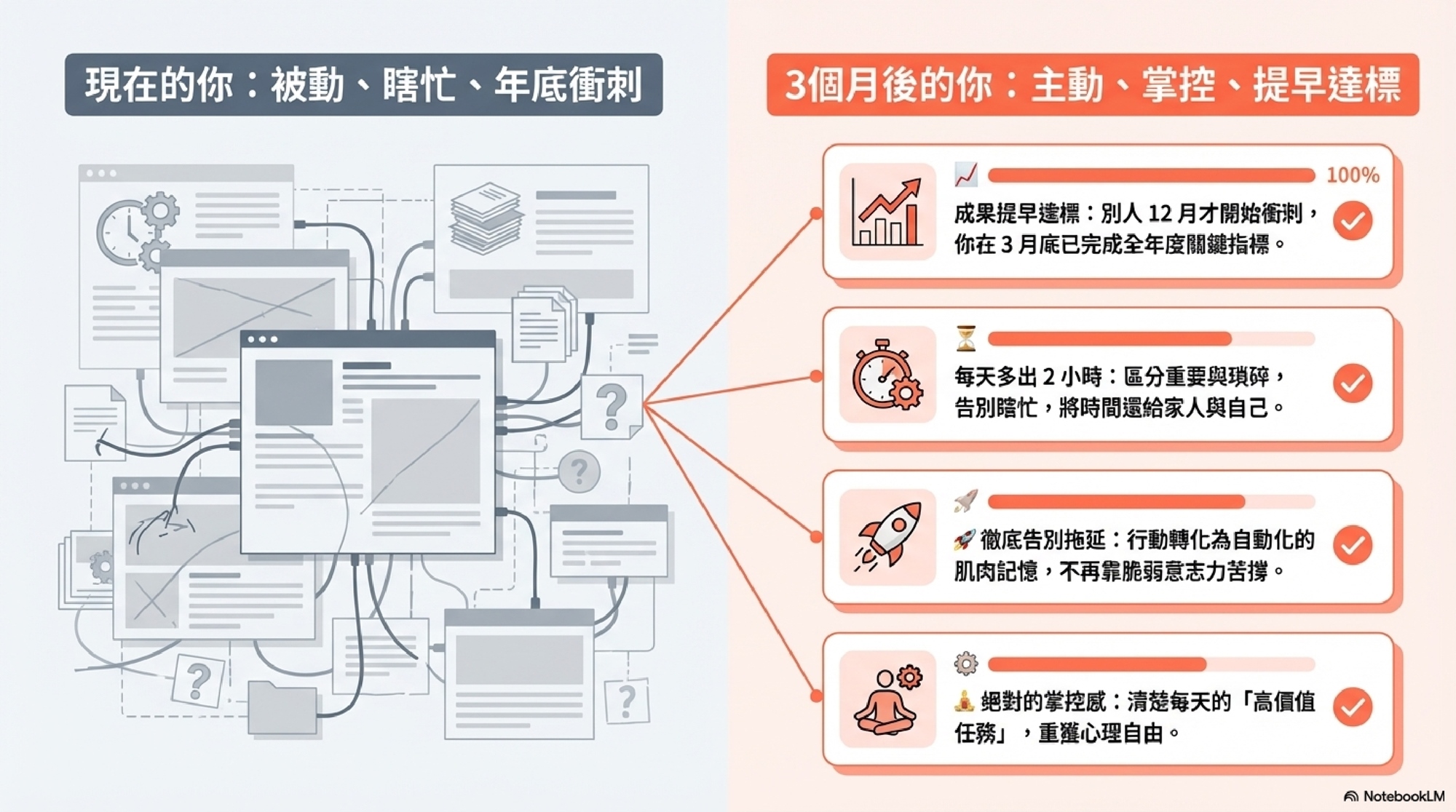 成果翻倍: 當別人在 12 月才開始衝刺業績,你在 3 月底就已經完成了原本預計一整年的關鍵指標。