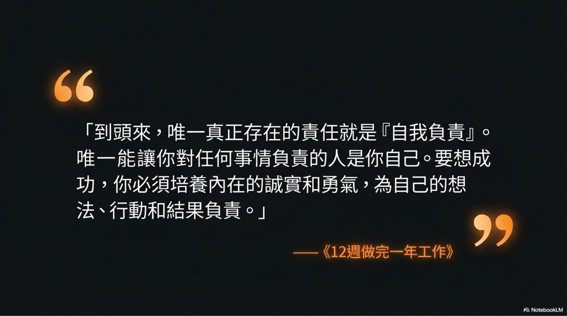 「到頭來,唯一真正存在的責任就是『自我負責』。 唯一能讓你對任何事情負責的人是你自己。要想成功,你必須培養內在的誠實和勇氣,為自己的想法、行動和結果負責。」