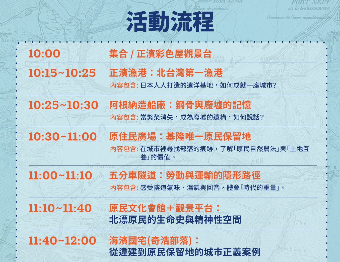 📍 導覽地點|正濱漁港→阿根納造船廠→原住民廣場→五分車隧道→原民文化會館→觀景平台→海濱國宅(奇浩部落)
