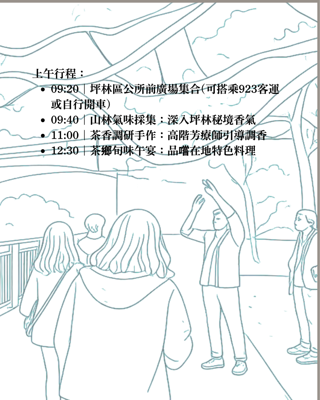 09:40 | 山林氣味採集: 深入坪林秘境,我們將帶你辨識原生植物,親手觸摸、嗅聞,採集當下最真實的森林氣息。